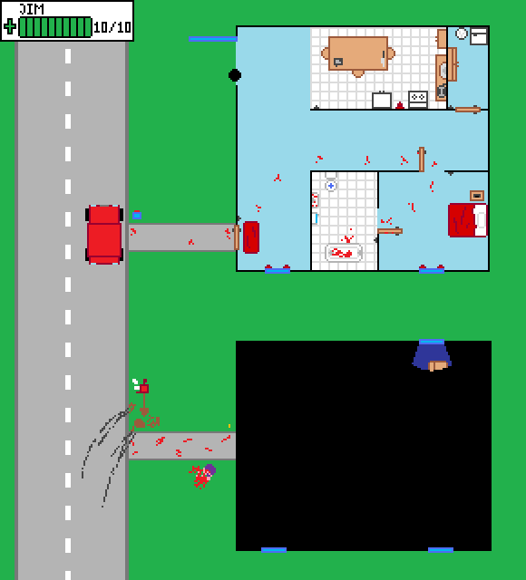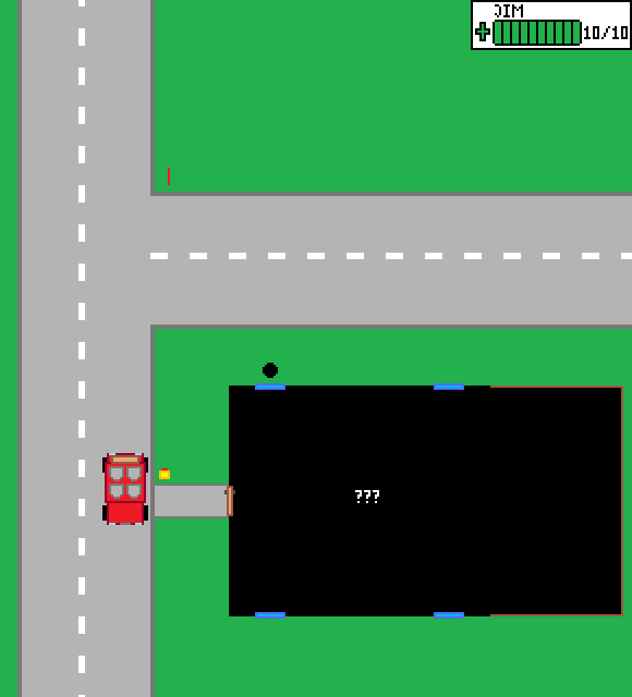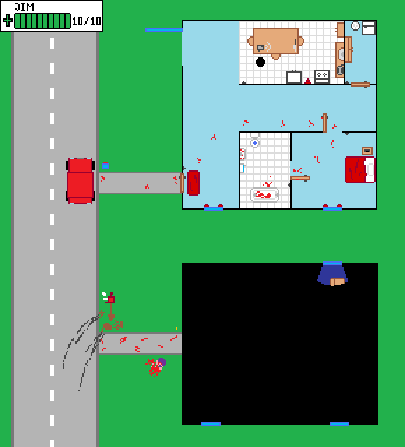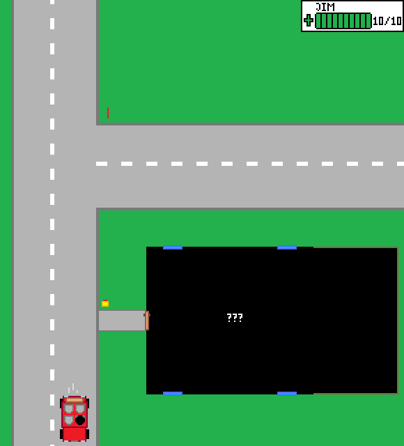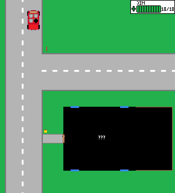 (The white text outside of Jim's house represents his memory of the area's layout. The black area will be revealed as Jim explores.)