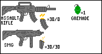 >Health (Charlie): 9/10 [Rifle-5/9][Assault Rifle-30/0][Knife][Pistol-5/15]