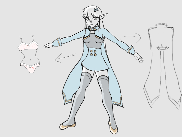 Well, miss Moonleaf, first keep in mind your priorities. As an adventurer, one of your chief concerns is not getting killed. To that end, you want garments which can afford you protection while minimalizing any restriction to your movement. From the slightness of your frame, I'd say that metal is out of the question. That brings us to boiled leather. Attached is an appropriate design, which I feel maximizes protection without hindering joint movement. There is some small hindrance to trunk torsion, and bending over backwards may be physically somewhat awkward, but I believe my slitted corset design minimizes these downsides.