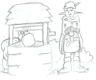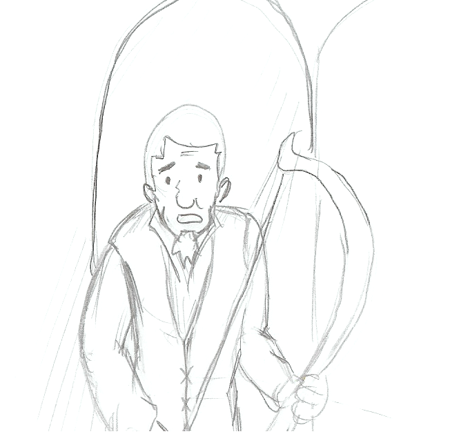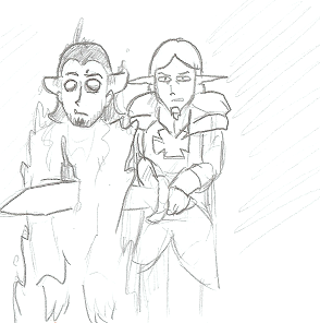 >It’s all been downhill from there. He fled his village, bloodied sword, until a town caught him and, when he refused to explain why his sword was bloodied, stuck him in the stocks for the paladins. Only after he was released did he realize that the town has threatened to allow the Paladins to kill him, and my terms forced him to slaughter them all. As he fled the town once more, he came face to face with a would-be bandit who he promptly decapitated and dragged through the woods, hoping someone would find the trail and… help him.