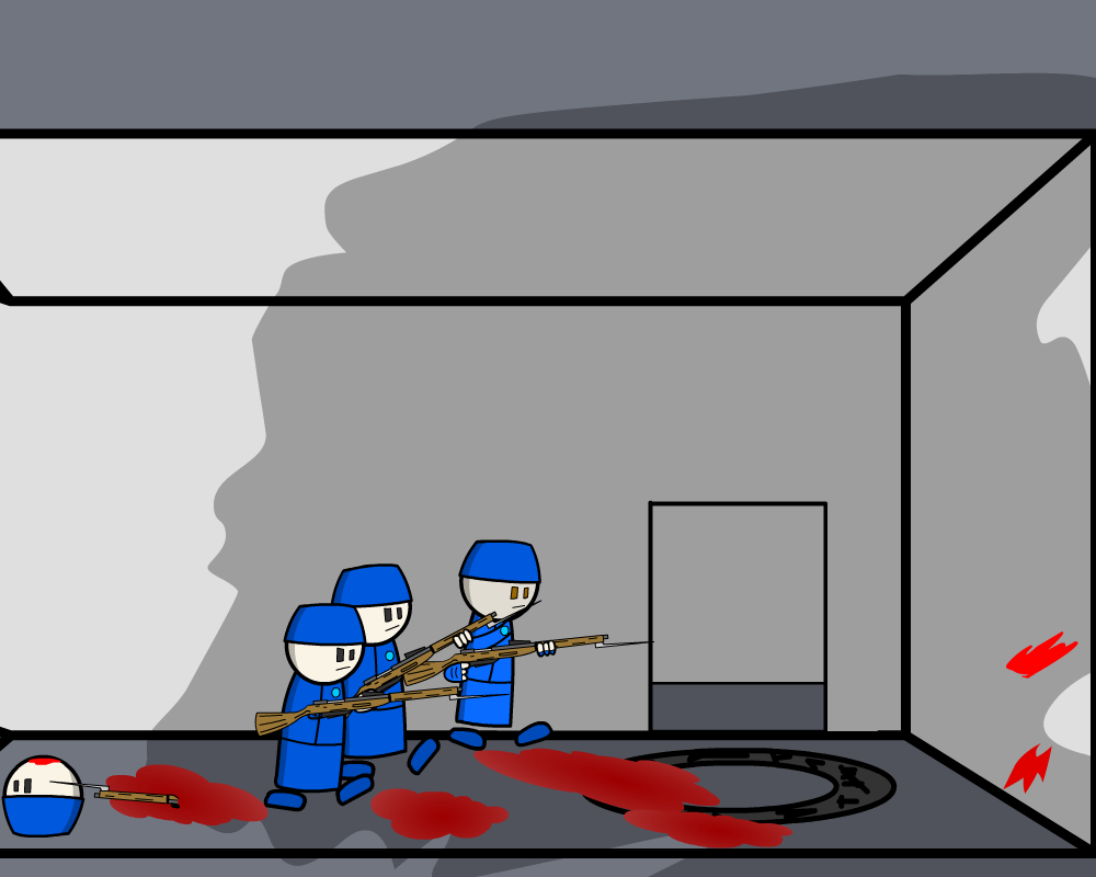 Part of the ceiling suddenly shimmers and a BlueFigure shoots the other Soldier (10) in the head for 14 Damage dropping him.