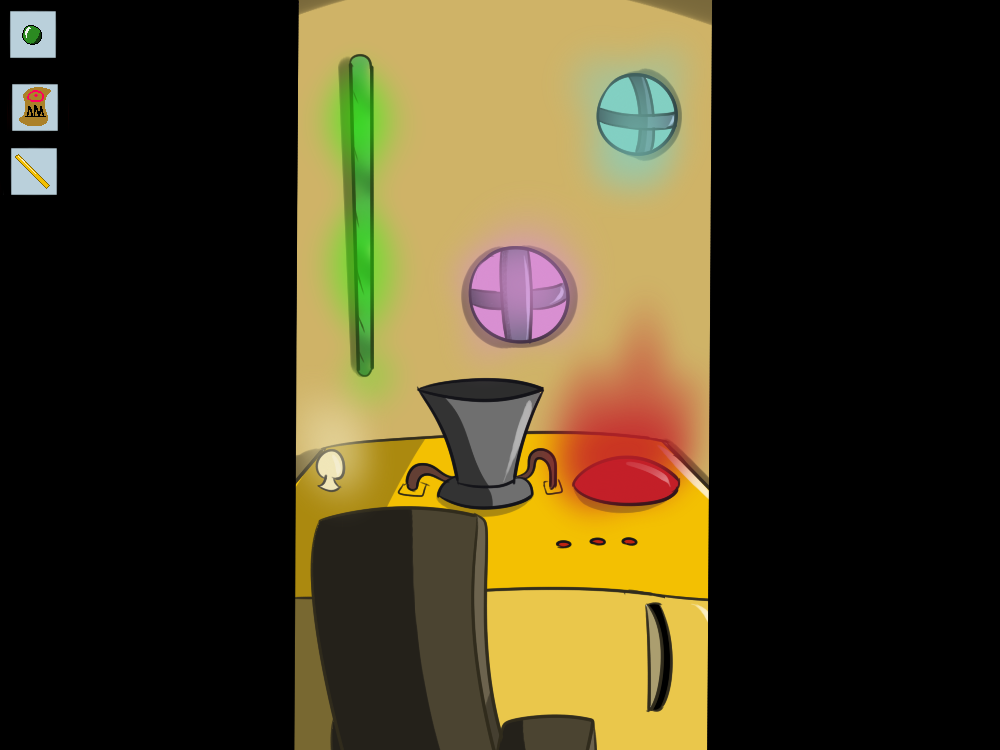 The door leads to a tall ladder, that ends up in a small room, with a chair and some kind of control panel. It looks a bit like the ones the flying ships have, but this one doesn’t make any sense! It has a lot of glowing bulbs of different colors an unlabeled switches.