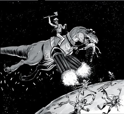 >flying on a gigantic police tyrannosaurus Rex