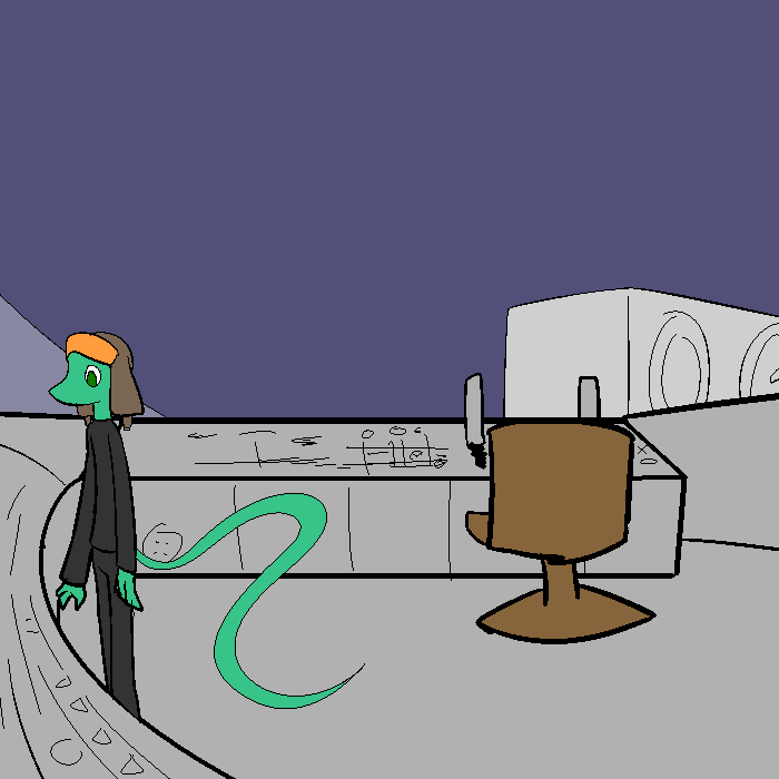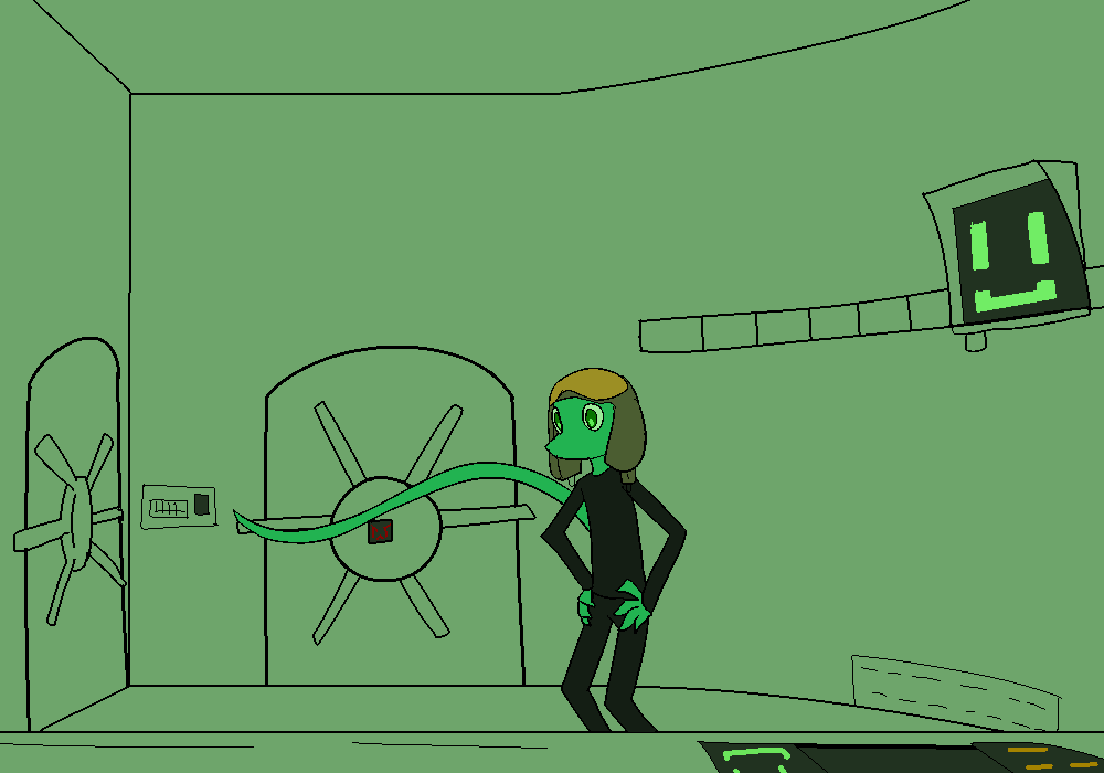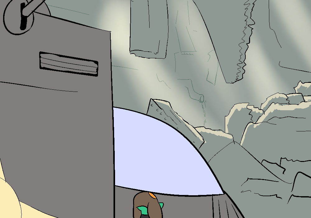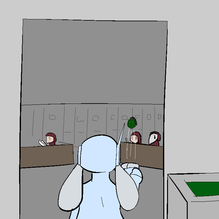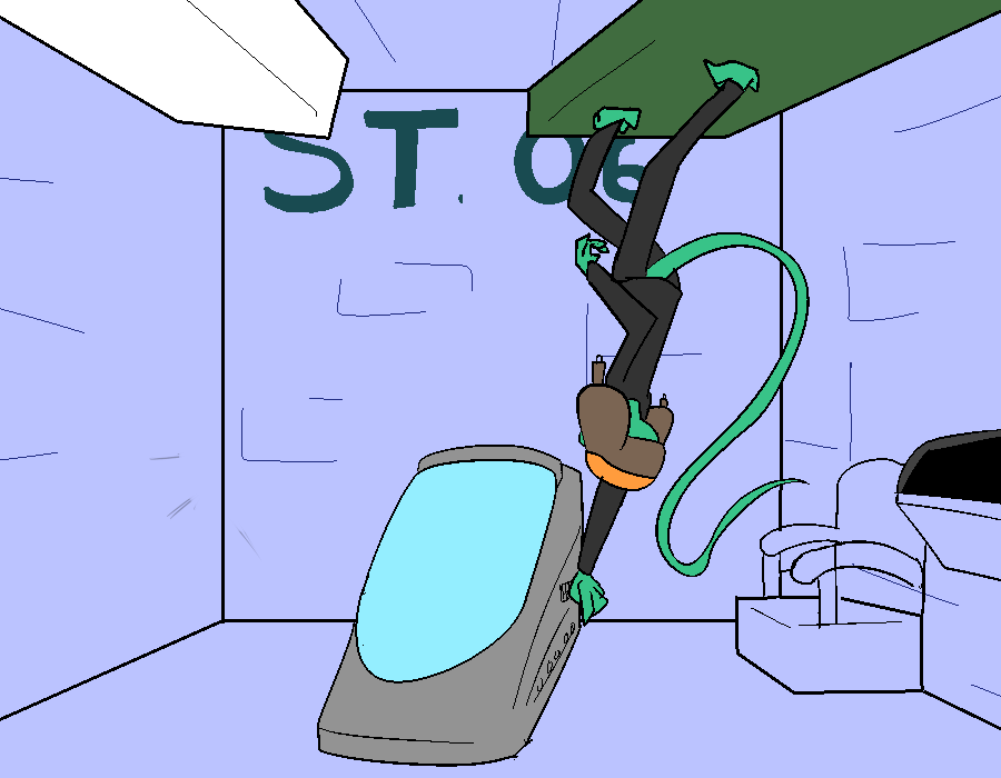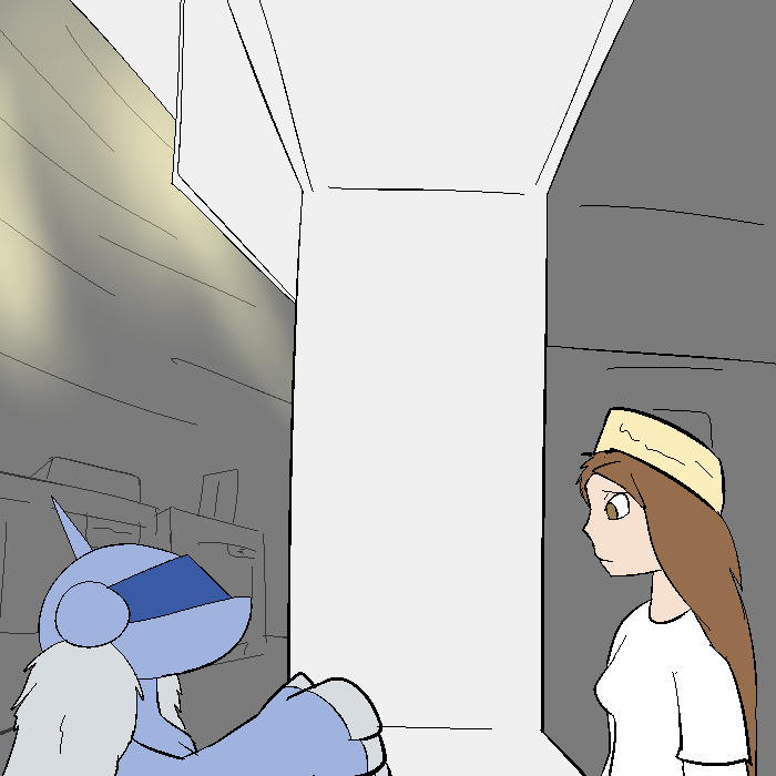 "Okay! Let me activate the main room camera. Right now we're in the lobby. The door to your left goes outside, and neither of our brains are H20 compliant. The door at back wall leads to the storage container. We'd need to go through the standard menu to open it, but they're horrible. Just, awful. It's amazing the technology this hunk of metal has, all laced with a poisonous menu. You might be able to get something to happen with random commands, too. You'd think going through the voice menu would be less risky. Nope."