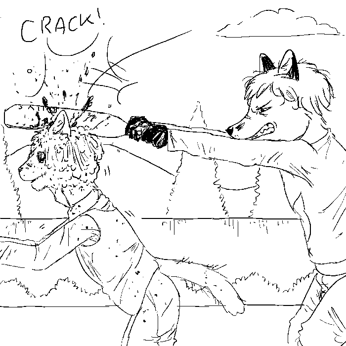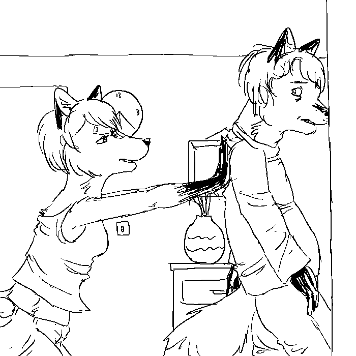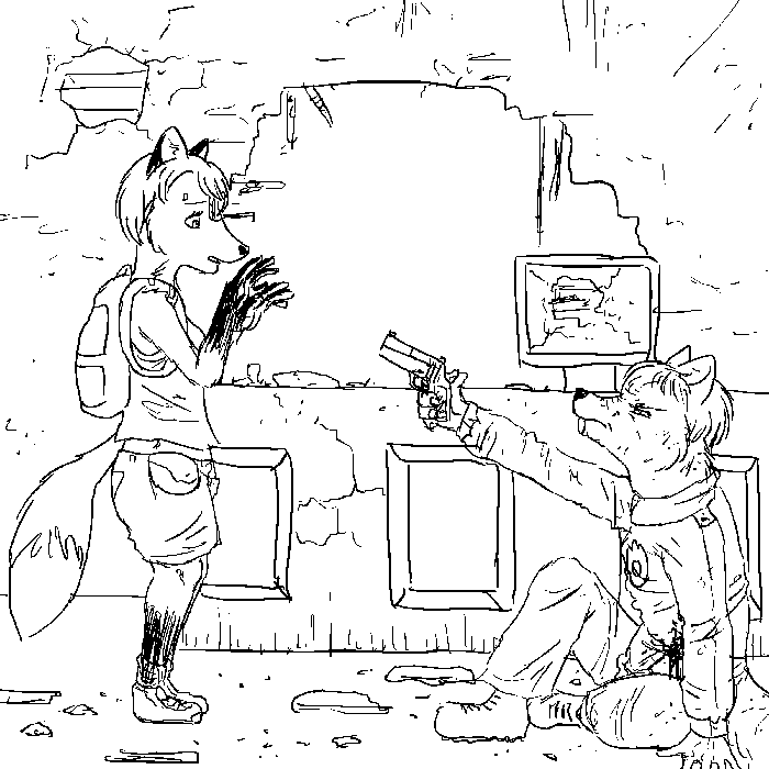 "Could you point that gun away from me, please? It's hard for me to think with it all in my face." He glares back up at Rina.