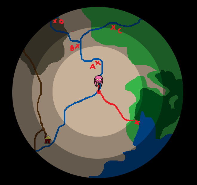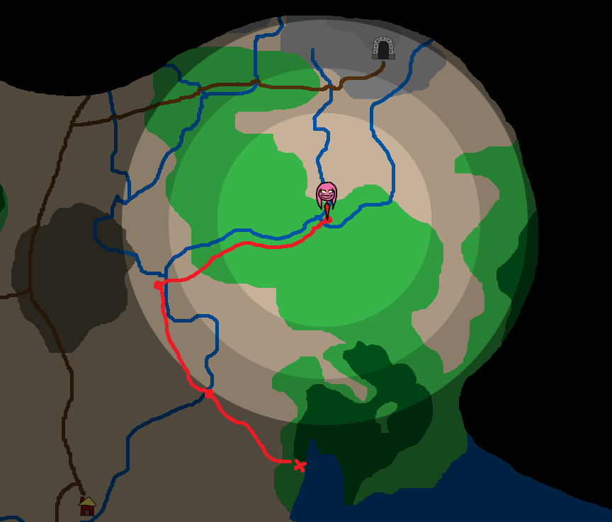 D) Looks like there is another 90 degree bend in the river up here. Could be indicitive of another river joining the current one. If that darker terrain (I am presuming it to be rocky hills?) is benificial to tower building efforts, then this is would be an excellent spot. If moving north at all, let's see what else of this location we can percieve.