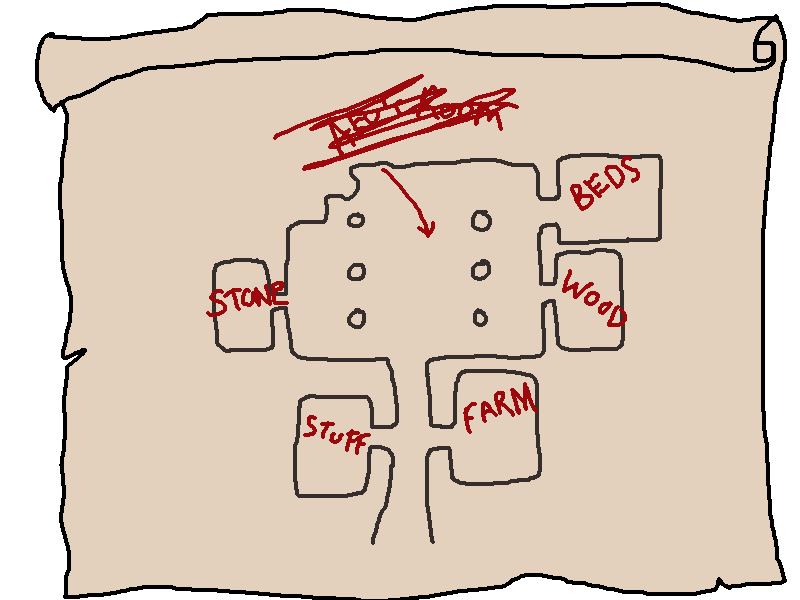 If we have to deal with anyone coming to try and reclaim the fortress however, they'll probably try to dig through the rubble or find our secret dside entrance. Therefore we need traps covering a long, winding entrance hall. It'll make getting in and out a little more difficult, and it will mean redirecting the entrances to the farm and storage but it adds a great deal of security.