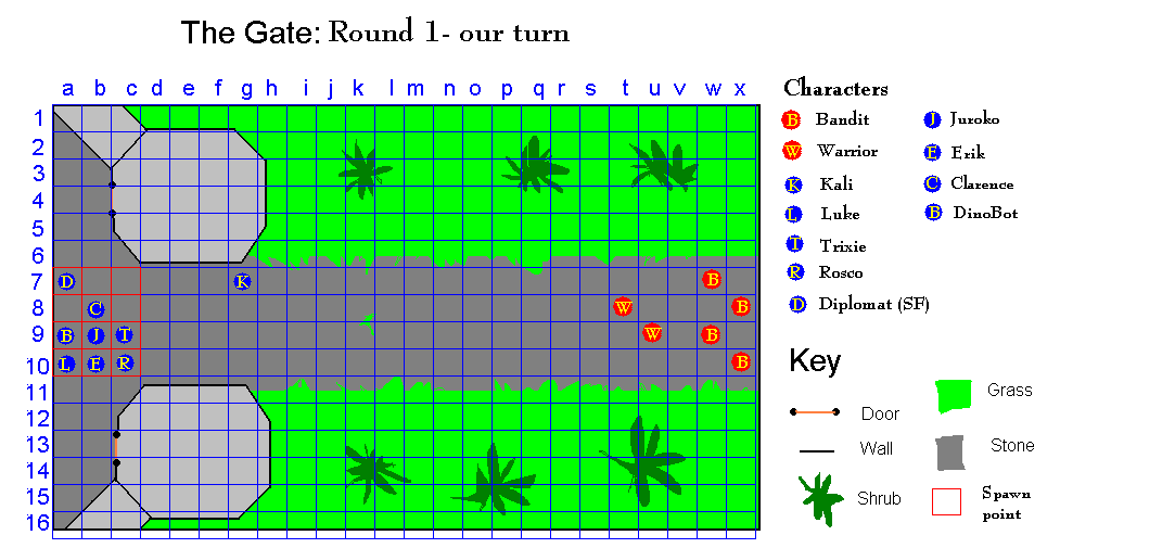 Character creation is simple, All characters start with the stats as the base unit in >>437769 and have one starting feat. You will be able to choose 1 armor and 1 weapon as you see fit. Tailor your character in a way that suits your taste of play- noted earlier that some armor and weapons will detract from defense and movement so try to make your build wisely. Also noted in the rules are objects you can interract with, some terrain can be used as defense or cover- such as walls or trees. Knowing how to utilize this will help in your conquest under the kings reign.