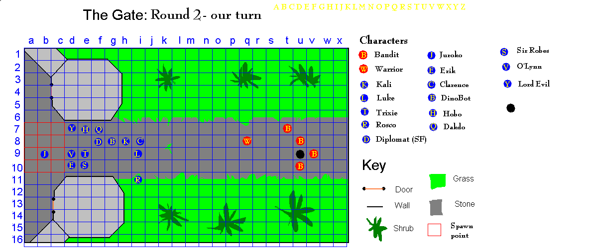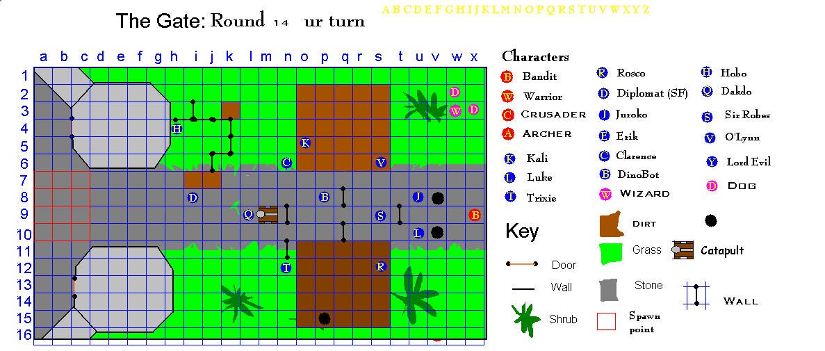 Everyone makes their moves, except dakdo and the catapult. The wizard chuckles to himself as he readies another spell for next turn. Juroko claims another body (2), Rosco claims a body, and Luke claims another body(2). Dakdo scores an assist (which for this purpose will count as a claim) and has 1 claim to his name. The bandit attempts to flee.