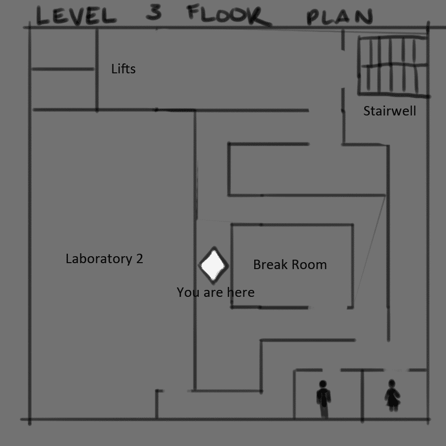 I make for the elevator, my reasoning being that I will be temporarily free of the guards, and that the buttons inside the elevator may allow me to understand whether I am above or below ground.