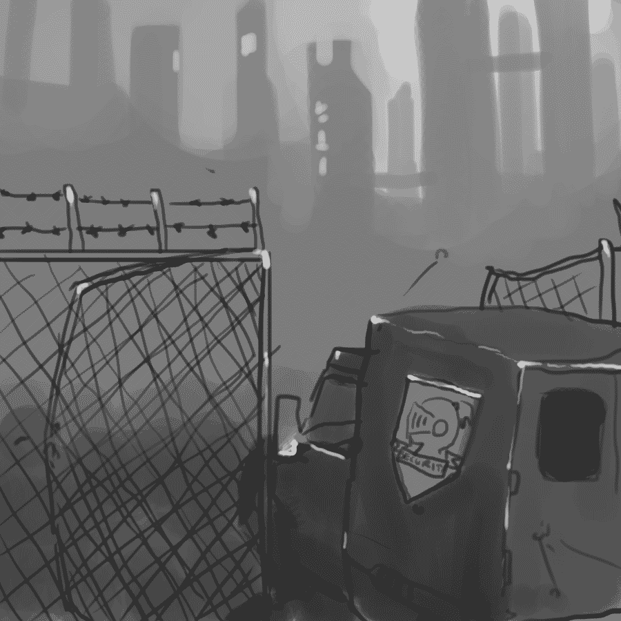 I am yet to escape truly. I need to escape the yard. There is a tall wire fence, which I could climb over. There are also vehicles on the premises. Some are civilian, and others are armouredd-d-d-d security vans. I do not know if I can drive them, and I do not know if they are locked.