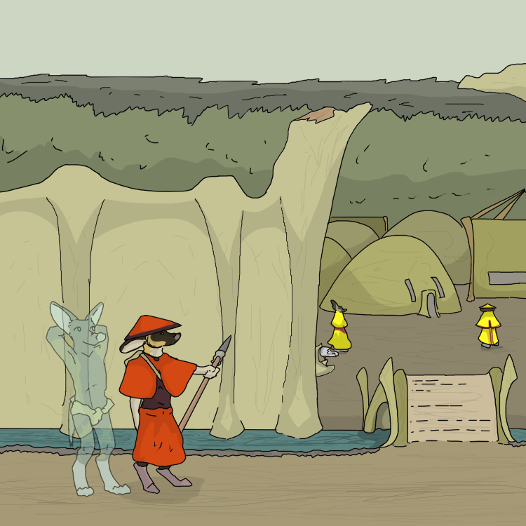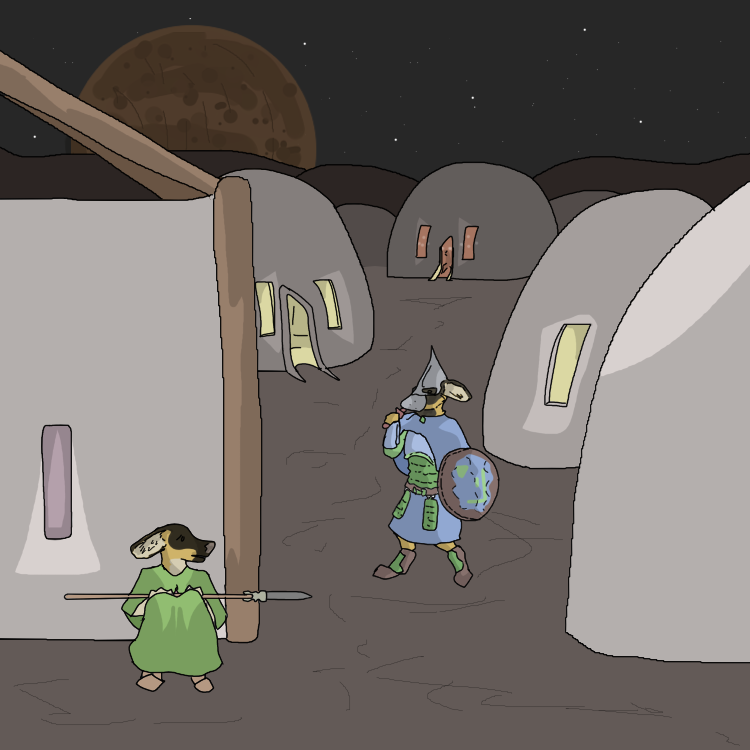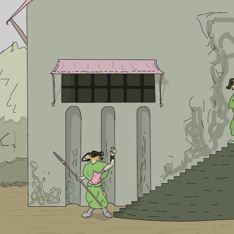 With my clothes this wet, my mantle is almost as dark a green as the town’s color. If I don’t make a big deal about passing them, they probably won’t even notice me! They walk right into the open and I just step around behind them. They’re too busy talking to even care! I keep on my way to the market.