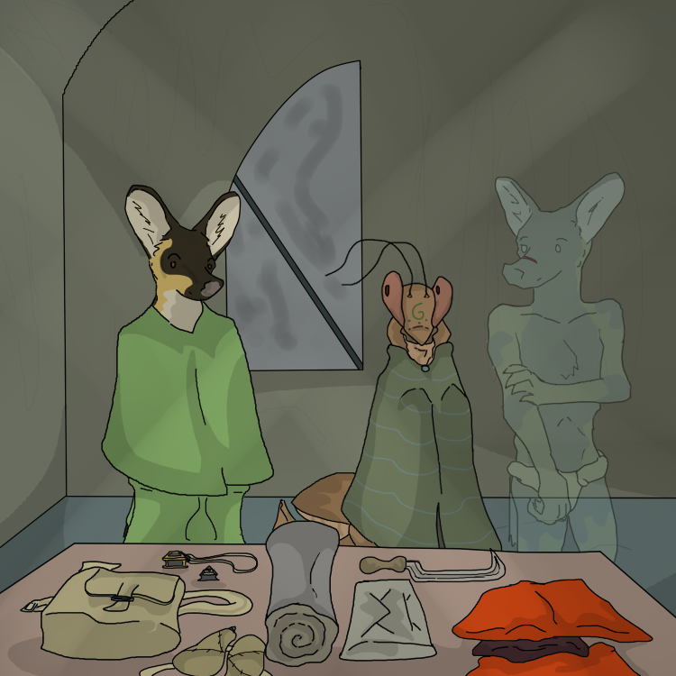Right to it. That’s okay. “I have, uhm, some ideas. A tarp, rope, a backpack, a sleeping thing of some kind, a blanket, a knife/hatchet, food and water as very basics. Uh, two smaller waterskins, with straps, if you can? I’ll need new clothes, too. Probably not in Tashikoxix colors. Can you even do that?”