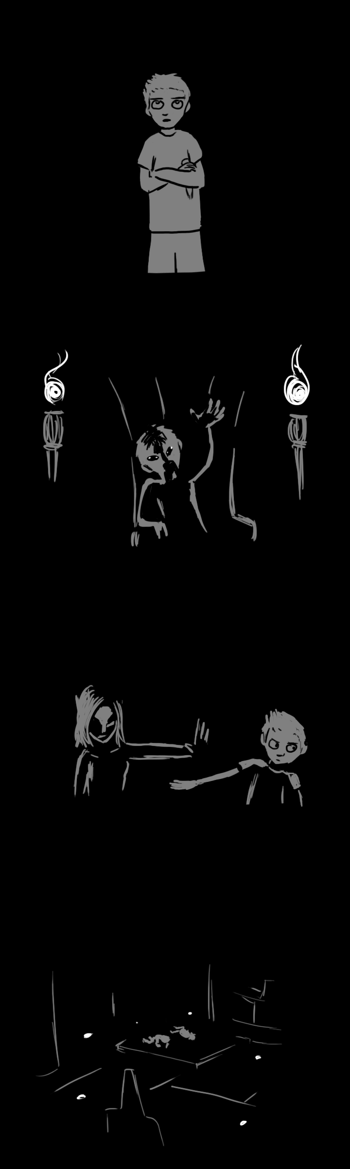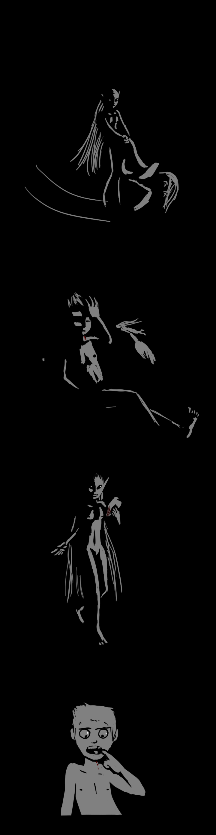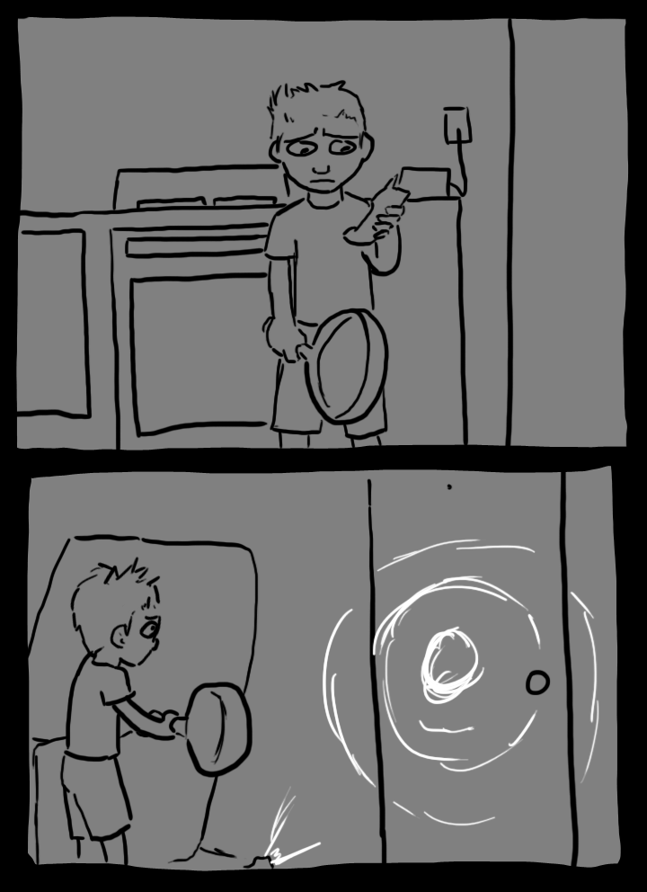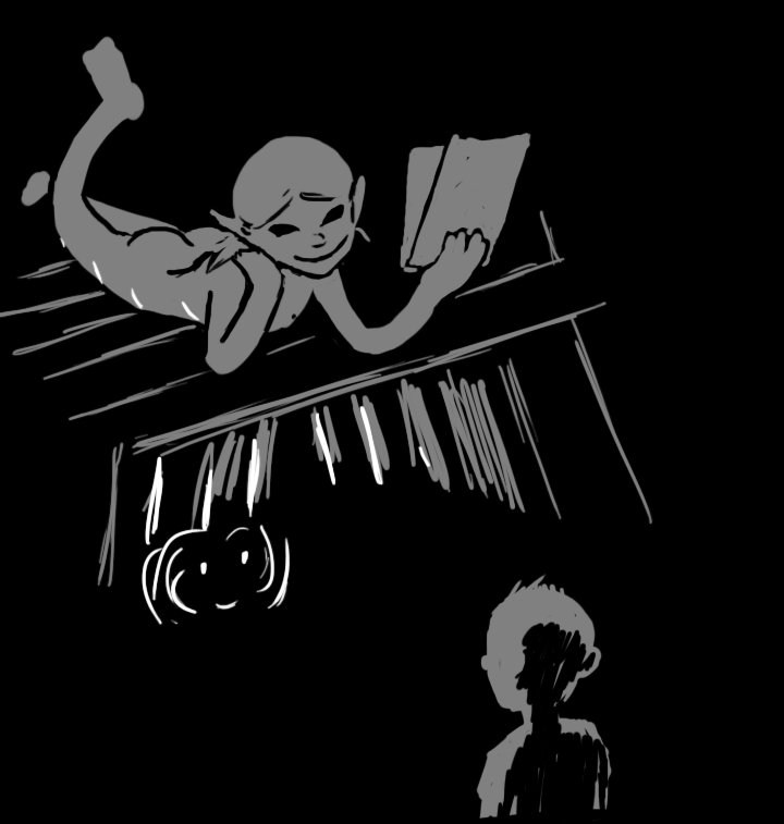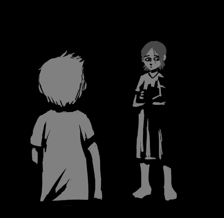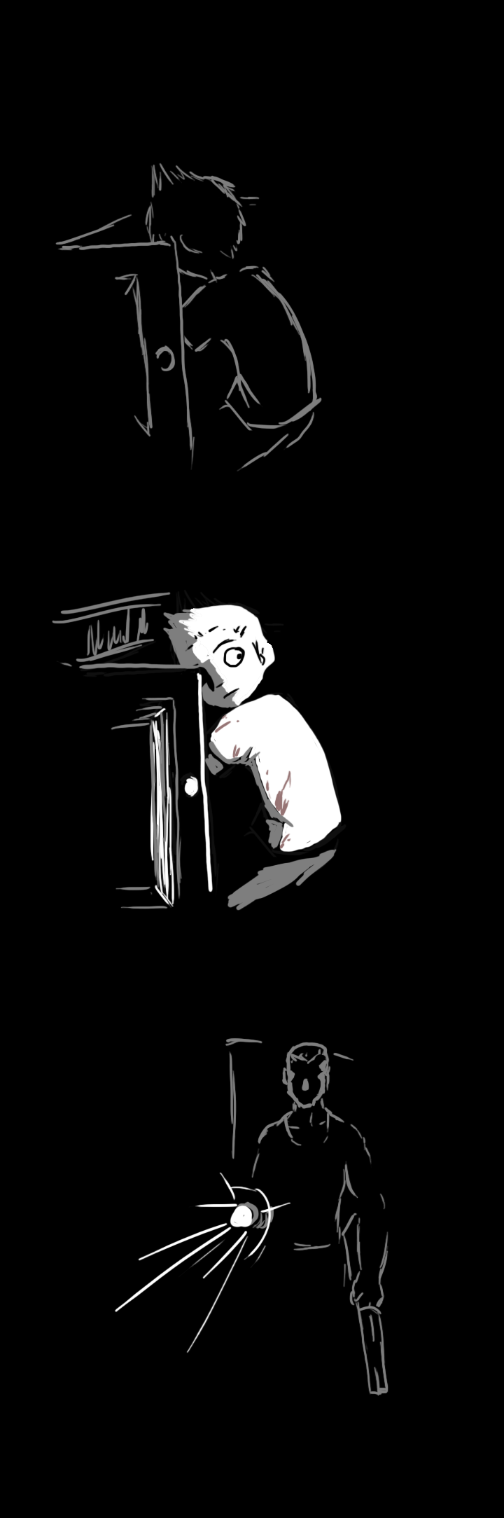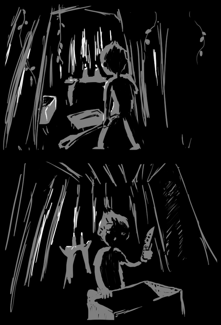 This time, the voice comes from the other side, to the right of the door. "Hee hee, you're a terrible drawer and a terrible liar too. What's the matter? You gonna poke me with that pointy thing, hmm?"