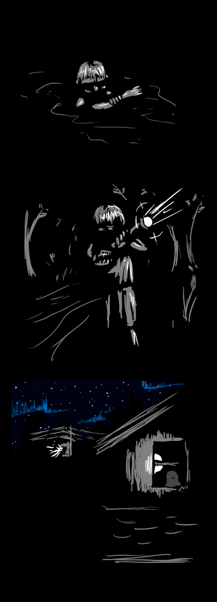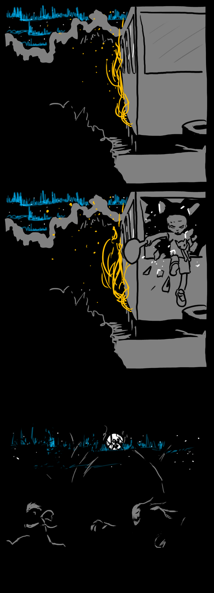 The two of you step over a patch of moonlight. The smell of smoke fills your nostrils. Overhead, the shimmering blue streaks waltz slowly across the sky. The sun is just beginning to rise over the city, which, you notice suddenly, is completely dark, save for a fire clearly visible a few blocks away. You don't hear any sirens. In fact, you don't hear much of anything besides the dull impact of your shoes on asphalt.