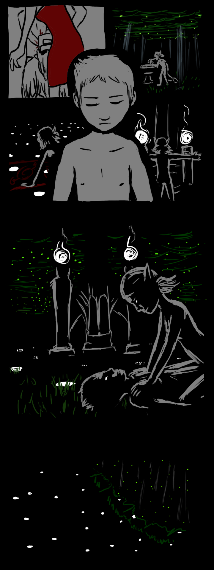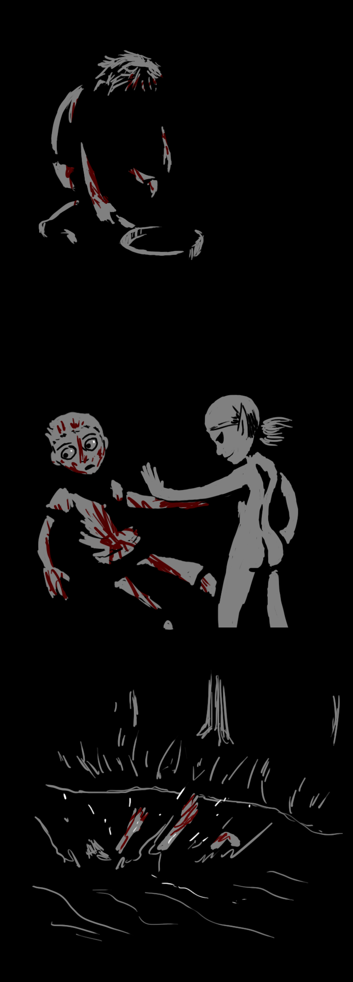 You hear a dull roaring in your ears and you go a little numb. Everything that happens next is a blur. Elle swoops in and does something with the body. You vaguely recall being whisked off to...somewhere else. Elle bustles around you and ushers you across several borders. At one point you have a faint memory of her telling you to eat and drink something, but you don't remember tasting it.