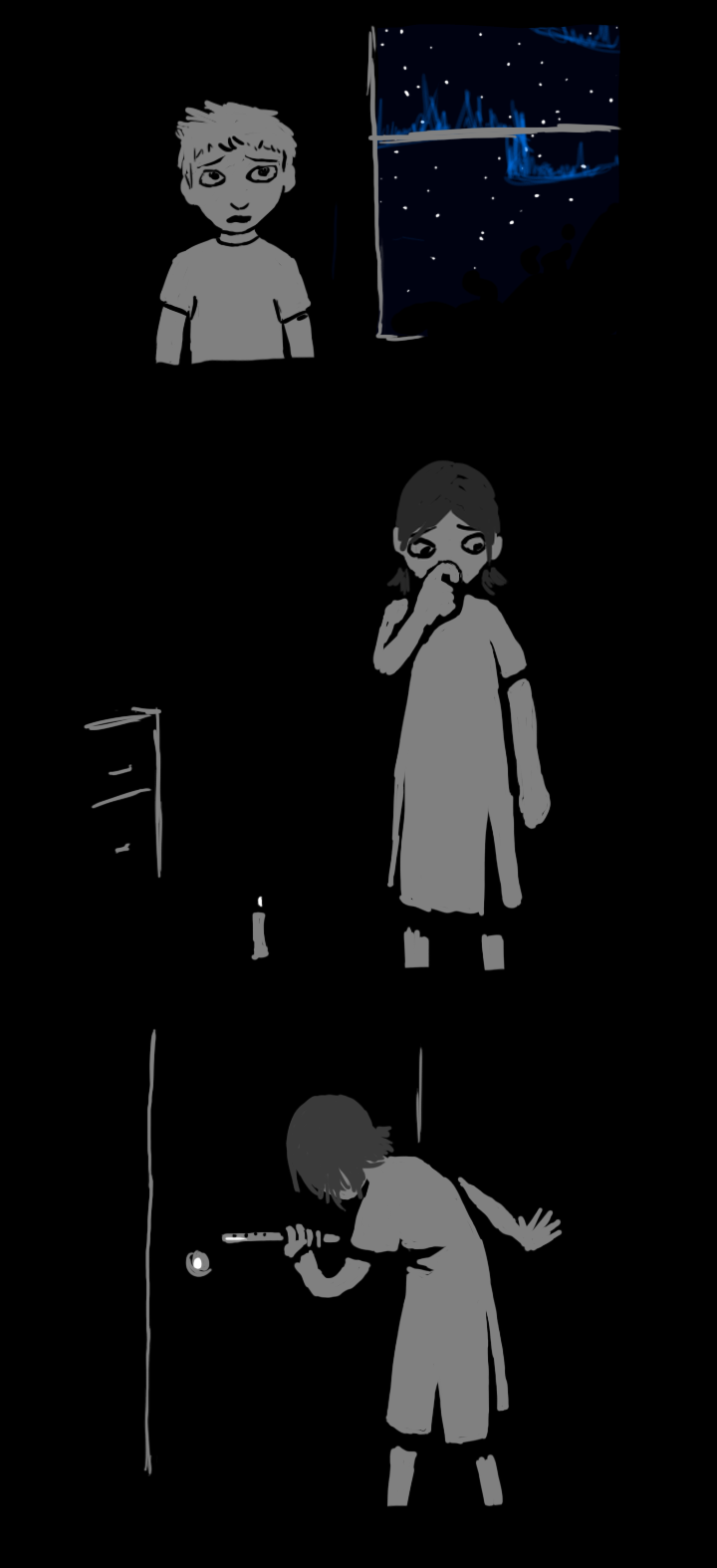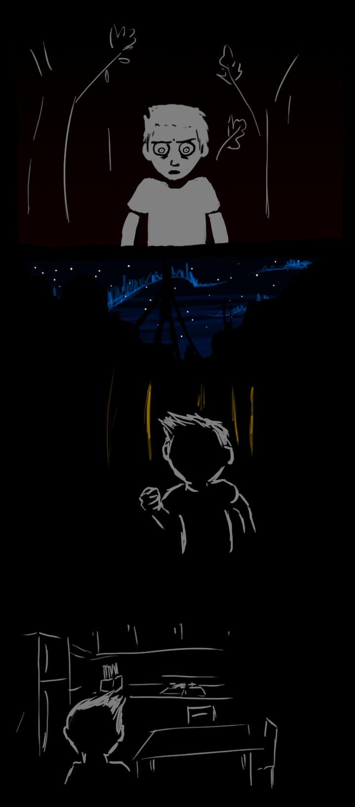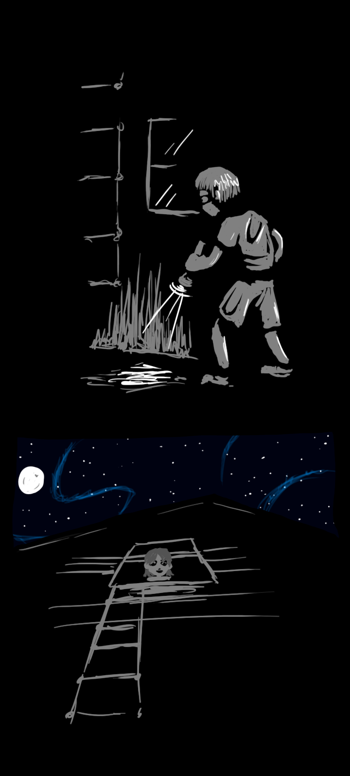 Your name is Evan Tolston and the night is your playground. Behind your house are deep woods where you can let your imagination run free. There's a great creek out there where you can go catch some frogs or dig up some crystals, a fort you've been working on out in a clearing, your father's shed with the broken lock, and who knows what else. You've never managed to explore the entire place. Where do you go first?