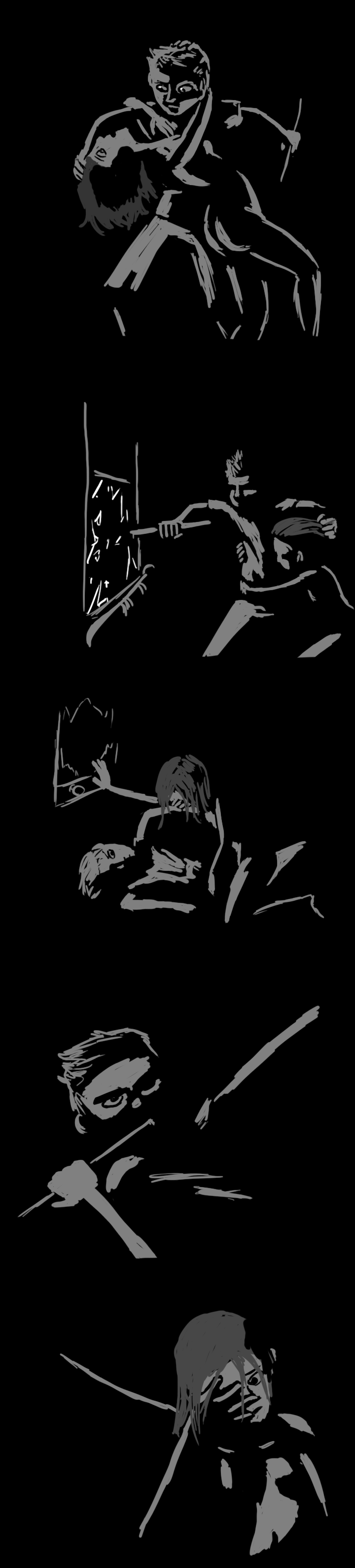 "Show me your back," you say. Almost as if in slow motion, you see the man push himself up and scoot in a semicircle to give you better access. You step up behind him, knife ready at the base of his skull.