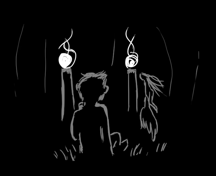 As you step around some trees obscuring the fort from view, you accidentally step on a twig, making a loud snap. The giggling stops, and you freeze in place. You peek around the tree trunk and you think you see something dark dart out of view. You are also surprised to see that the candles inside are lit and...