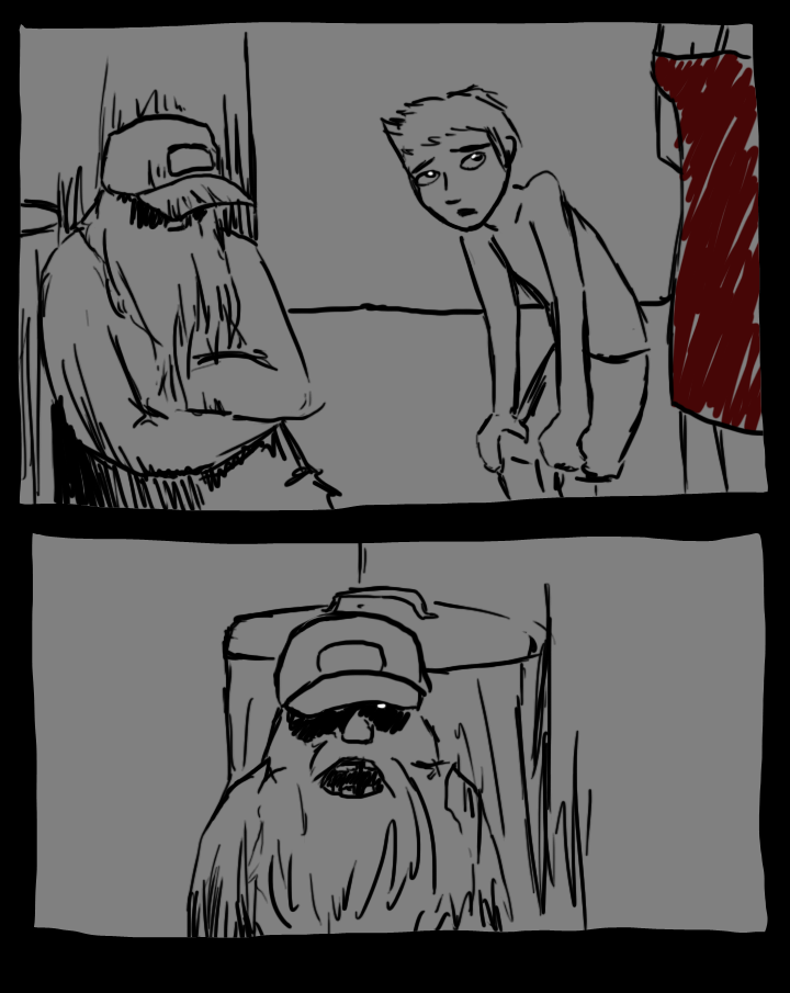 "World's ending, boy," he says. You realize it is a homeless man whose grimy hat and jacket are so filthy they perfectly match the outside of the convenience store in the dim light. "You should get on out."