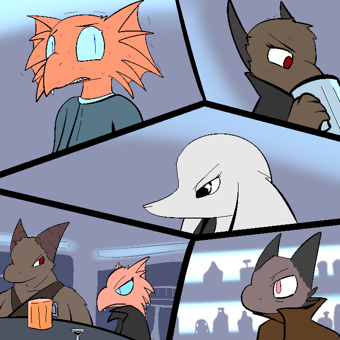 "Hey! Hey, one of you non-Zozu goons, come over here!" Karri hears the bartender say.
