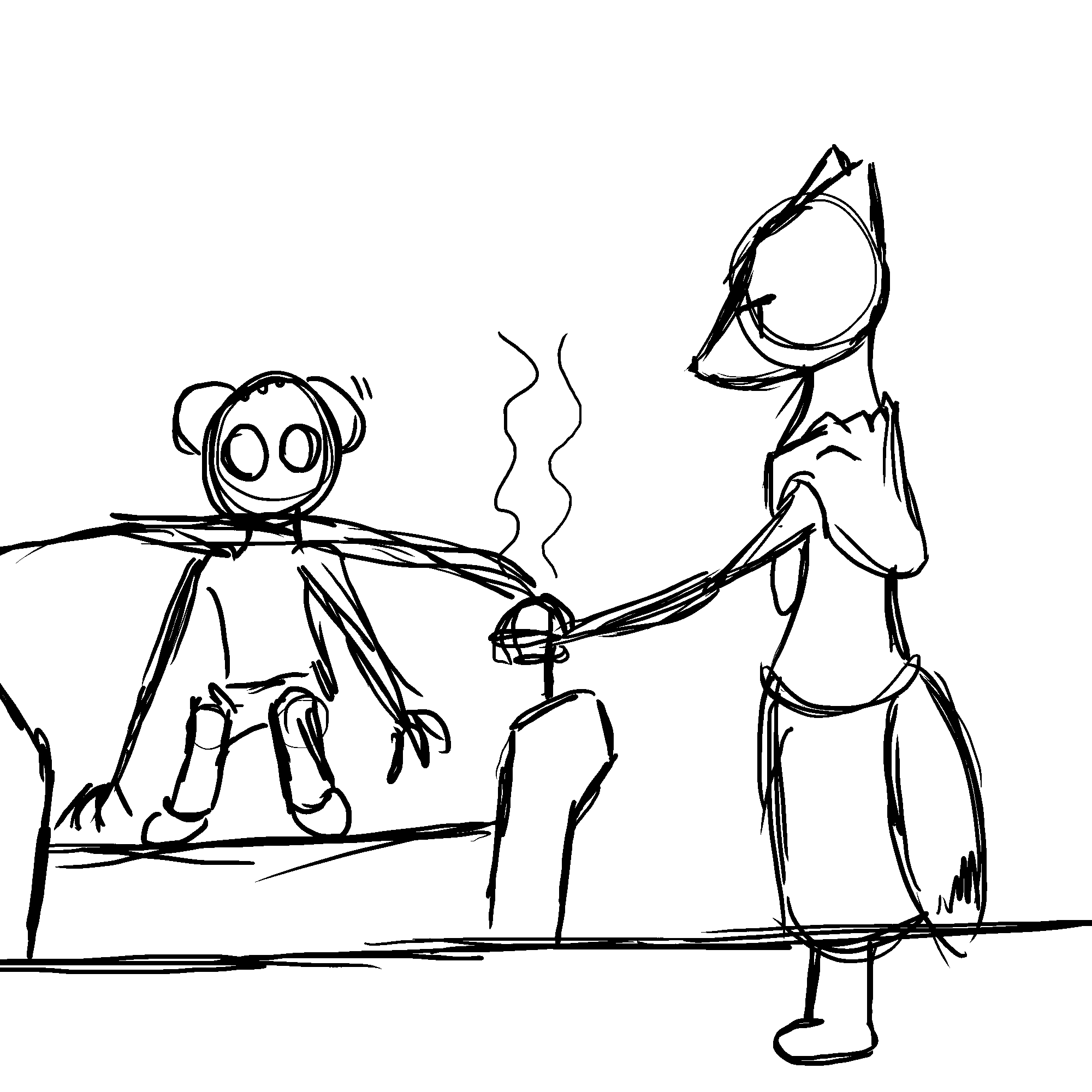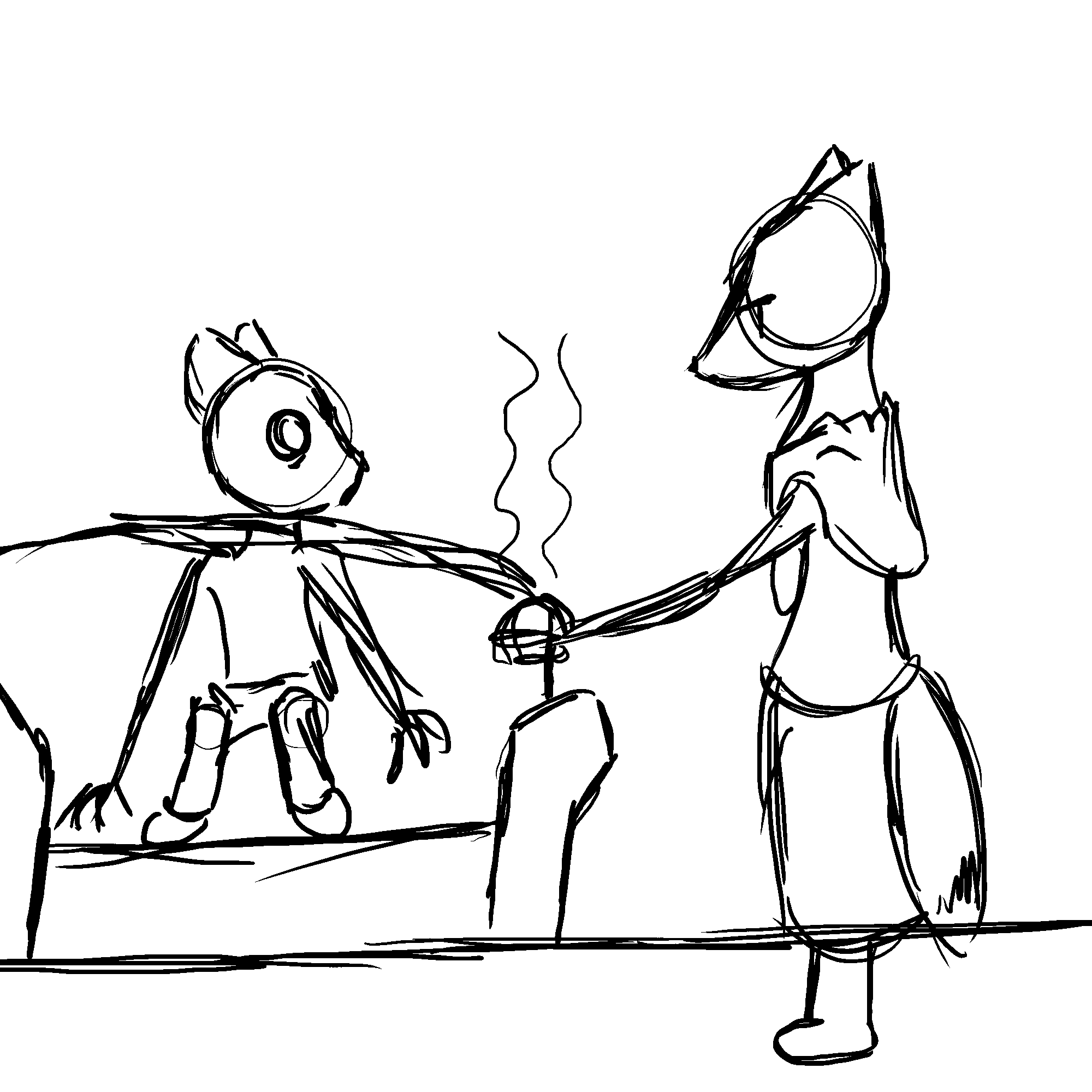 "Hey! I dragged him to safety, made him his own meal, and brought him down a bed. I think he'll be fine with making me something. And...A few days before this all started. It began as whispers."