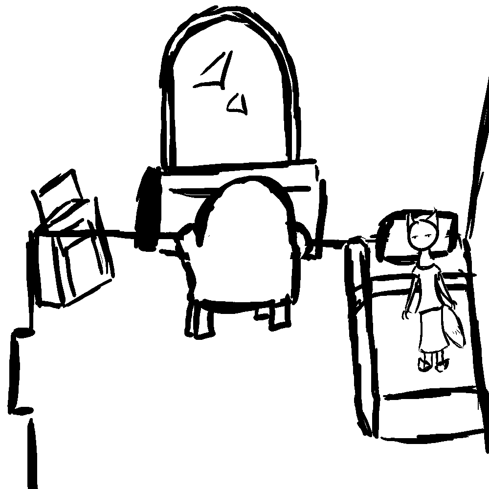 I open my eyes-the room is nearly blindingly white. There are two giant light fixtures embedded in the ceiling, but neither are on. The light is streaming in from a single window and a door that seems to be behind a curtain.
