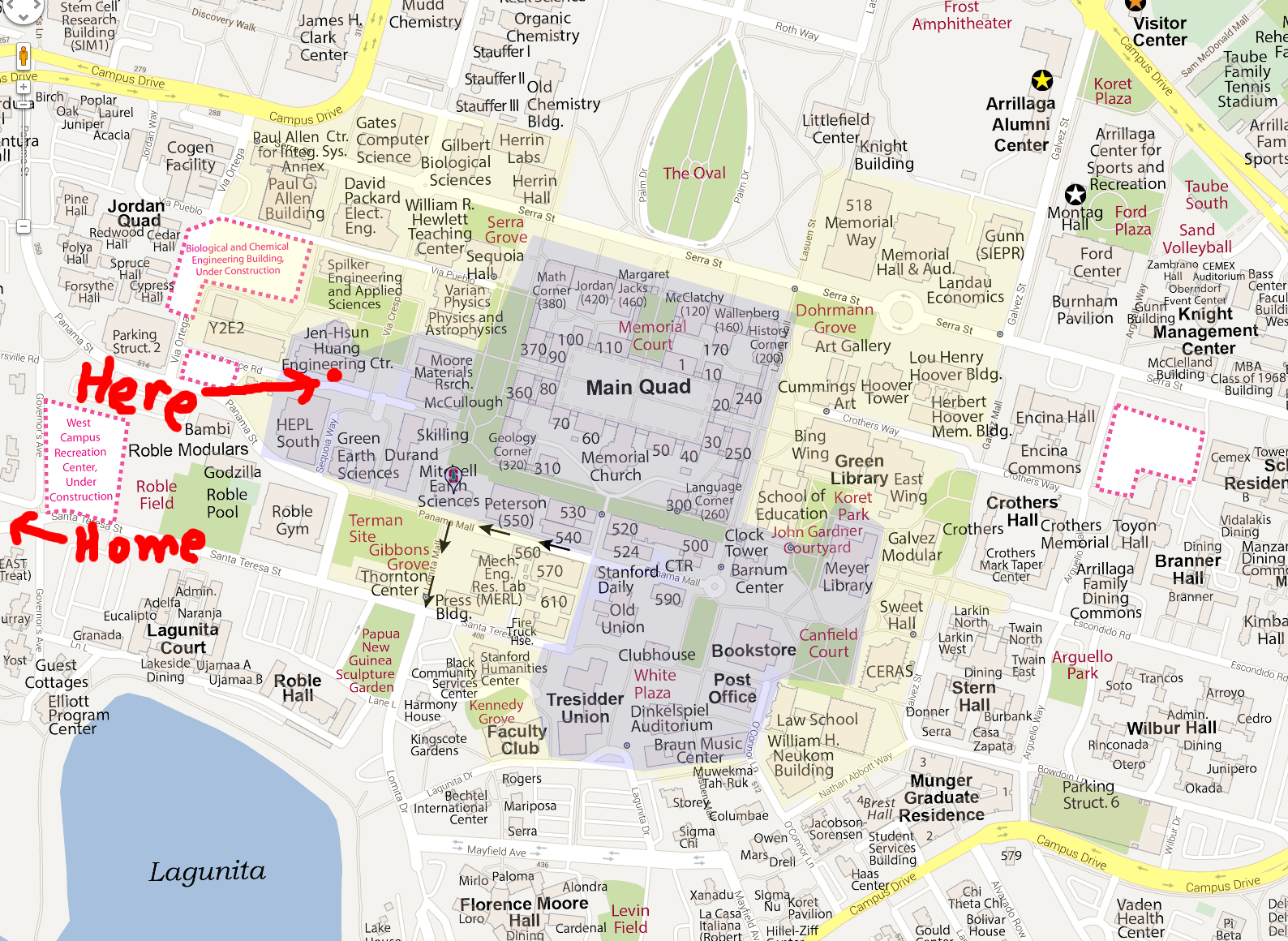 Here's a map of most of campus. The blue shaded area is what I'm passably familiar with.