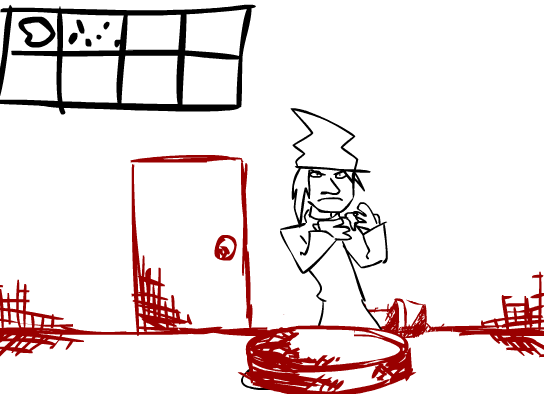 In the foreground we notice his pet cactus Clarice, and behind him is a door which leads to his bathroom. He will be occupying said bathroom fairly soon if things go his way.