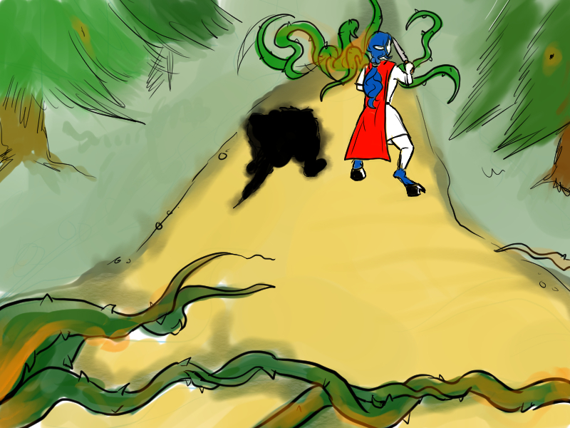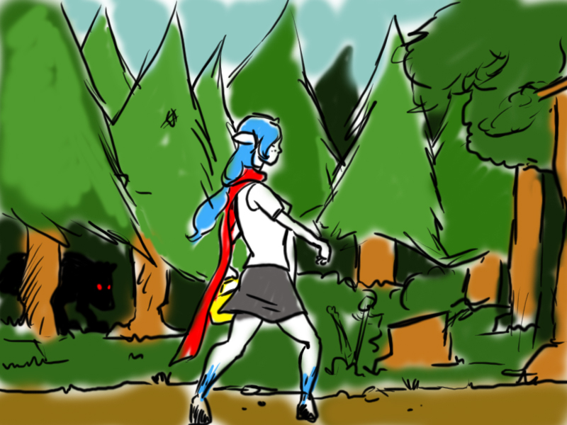 Feeling confident now that she has some sort of protection, Nem strides down the path towards her grandmother's house.