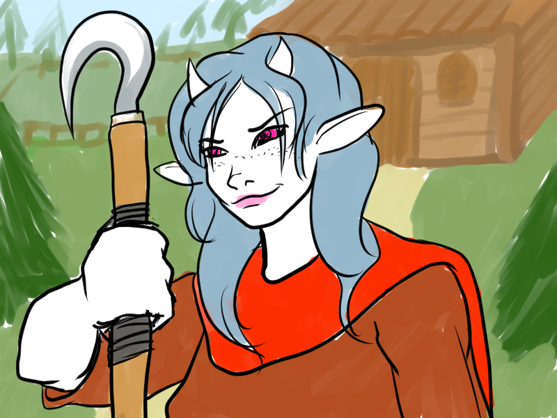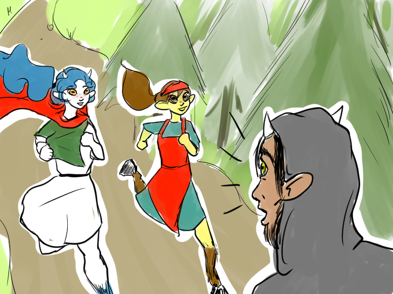 Nem: Oh, that's all right. I really wasn't sure if the charm was real or not anyway and I'm glad for any help. My grandmother is sick, so I've been asked to take some goods to her and build her strength back up. My name is Nemain and I'm a blacksmith's daughter. The path is supposed to be enchanted so it's safe, but I've been told that the woods themselves are territory of the Unseelie Court. Mother just told me about my cape's charm today and she seemed a little anxious so I thought I'd use it just in case.