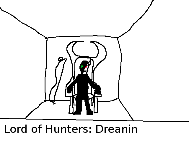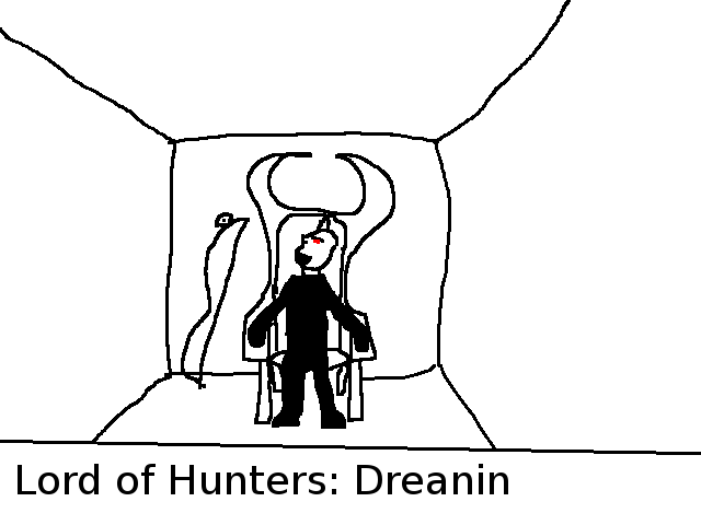 Remember that map I drew? This guy is the Lord of the Hunter clan. As such, he's the best archer, marksman, assassin, tracker, finder, and all around badass when it comes to hunting. His black leather outfit is stronger than most steels, but counts as beast hide. The Warriors, on principle, are Allied with the Hunters. He doesn't need ammo for that bow, either. He only launches one magical arrow from it... and thern they clone in midair, 2, 4, 8, 16, 32, and finally, a hail of sixty-four arrows from one shot. And he can fire five times a second. Last guy you want to piss off, especially here, because the arrows bass through trees and vegetation and walls.