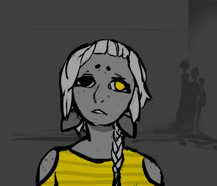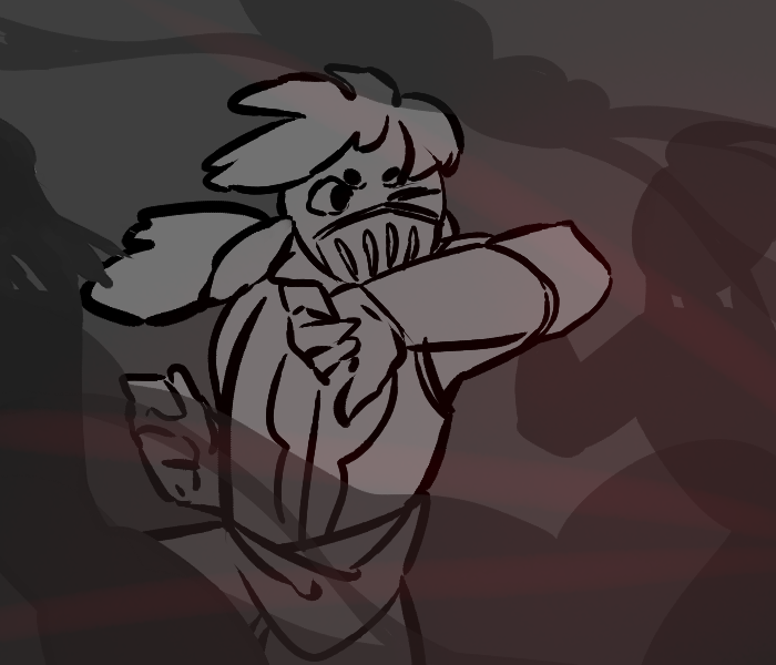 The group runs back inside to find the warehouse floor choked with smoke. Daffodil is nearly bowled over by the jostling, panicked bodies shoving and trampling over each other to get out, and Cadmium grabs her to keep her upright.
