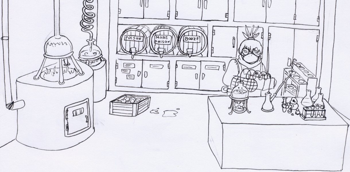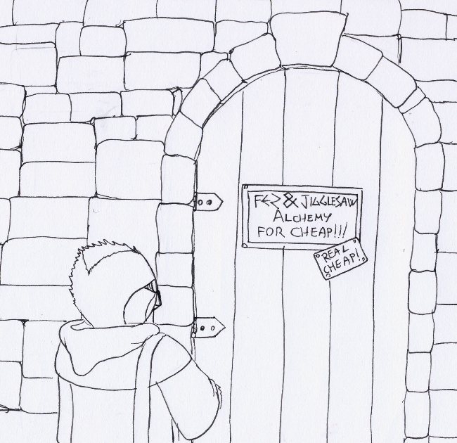 Fez: "Greetings, I am Fez and welcome to 'Fez and Jigglesaw Alchemy for cheap'. We do alchemy for a way too reasonable price, and we are both patented and capable alchemist. We have a range of potions that rivals the biggest shops in the capital. We have whatever you need, and if we don't we can make it in no problem in our laboratory in a short time. How may i help you this day, dear client?"