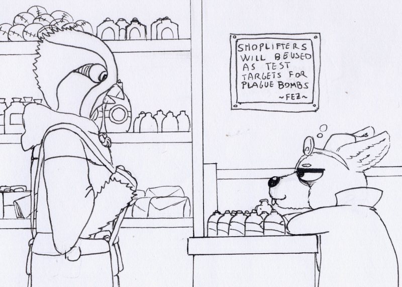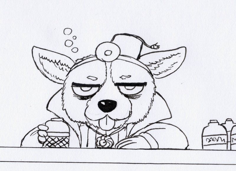 The shop is desert, aside for a small, tired-looking, houndling sitting behind the counter, sipping a flask of what looks like whisky.