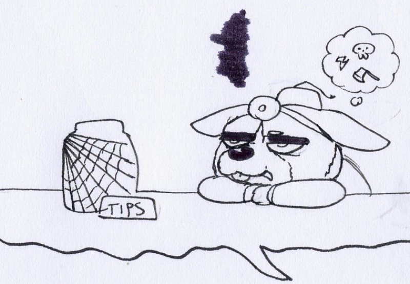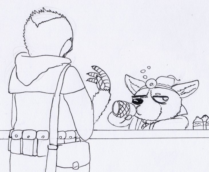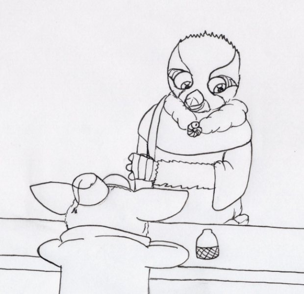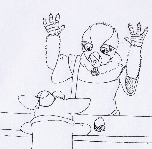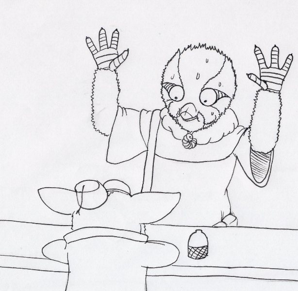 The tavern is relatively empty at the moment. Only Flycatcher, Takabanda and what you imagine should be the owner are here. The place is covered in shattered glass, the young Houndling girl is angrily shouting at your bard companion, while Flycatcher is sitting on a table, removing shards of glass from his face.