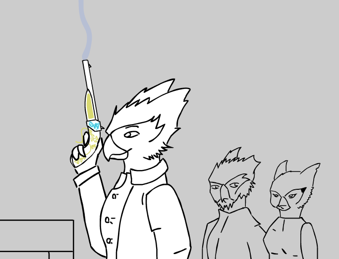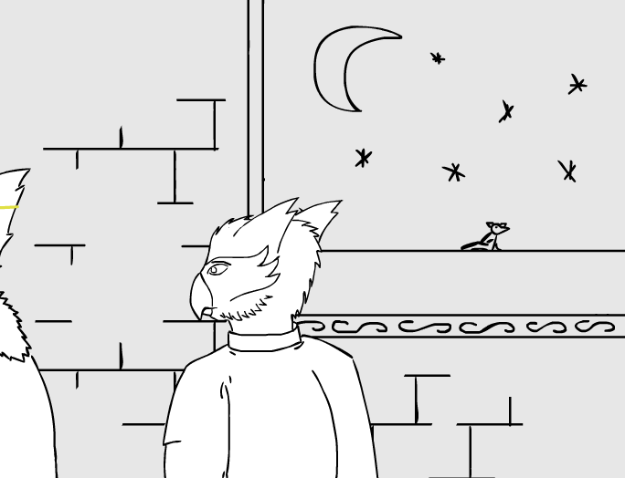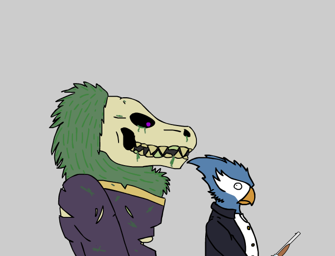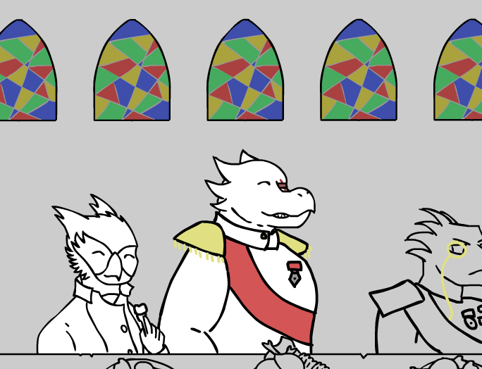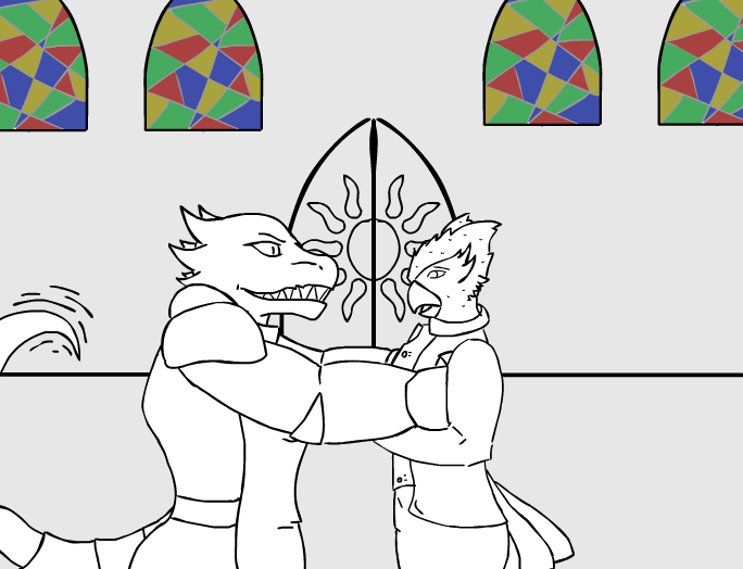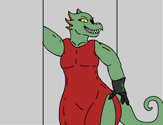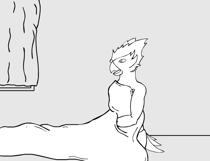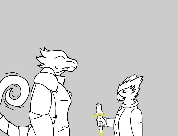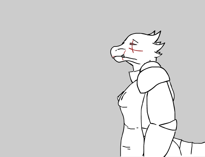 Oh, no, you quite like it when she smiles. It's when it goes beyond a smile into a toothy grin that it reminds you of... Of the recurring nightmare you have of that horrible day twenty years ago. Of the part when the carriage door is wrenched open and a grinning female Sakkilian leans in, p-pointing a h-halberd at your m-mother's chest for an eternal agonizing moment before... B-before driving it in... ...You know eventually you'll get used to Briannah's grin and it'll remind you of her and not the nightmare, but here and now it does.