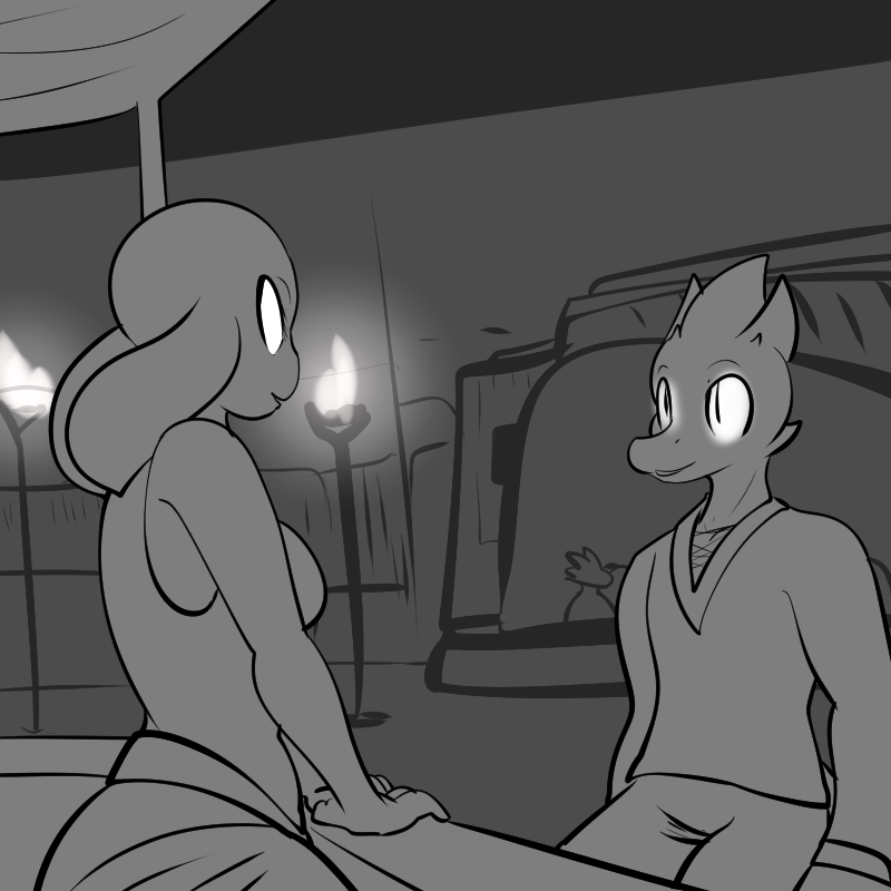 Come to think of it, when's the last time we actually slept? Ugh; too bad we probably can't leave Kexluk to guard Reilqin alone. He still seems just as vulnerable as before to females, and even though he might try harder for Reilqin, we shouldn't take that risk. We either need to sleep in shifts, or depending on how light of sleepers we are, sleep on top of or clutching the chest. I don't know if we can fully trust the goblins with the chest either.