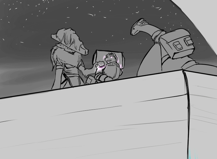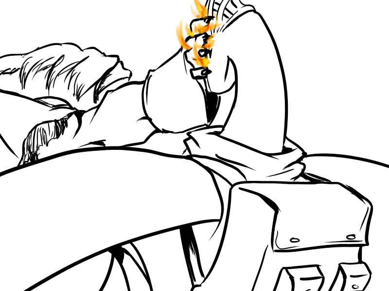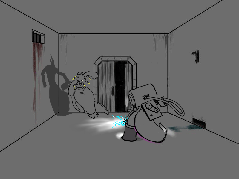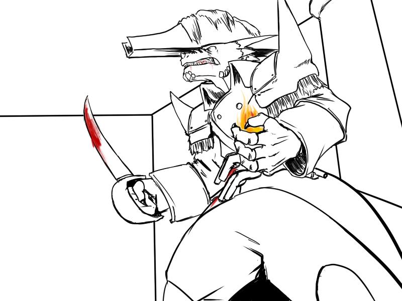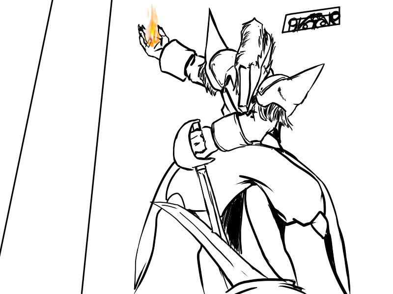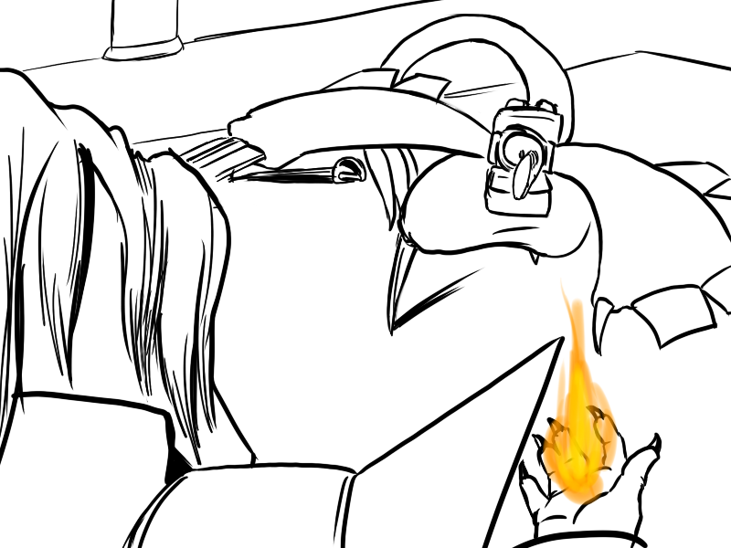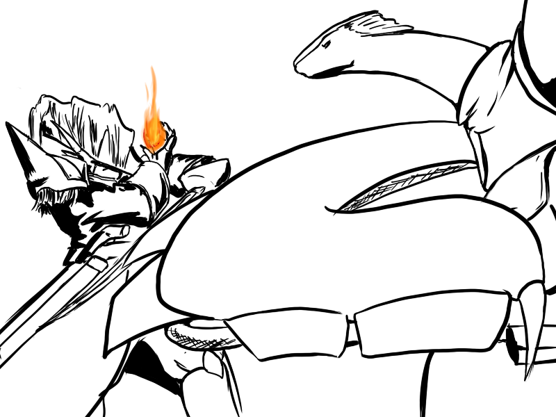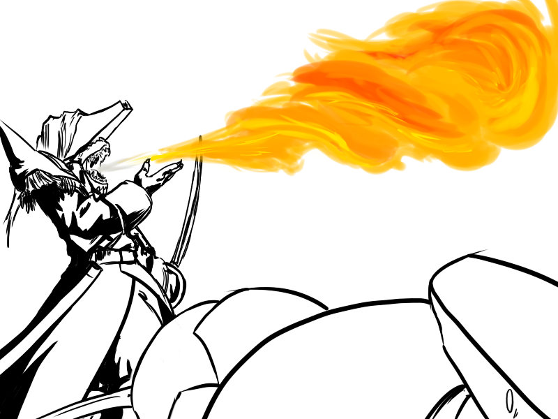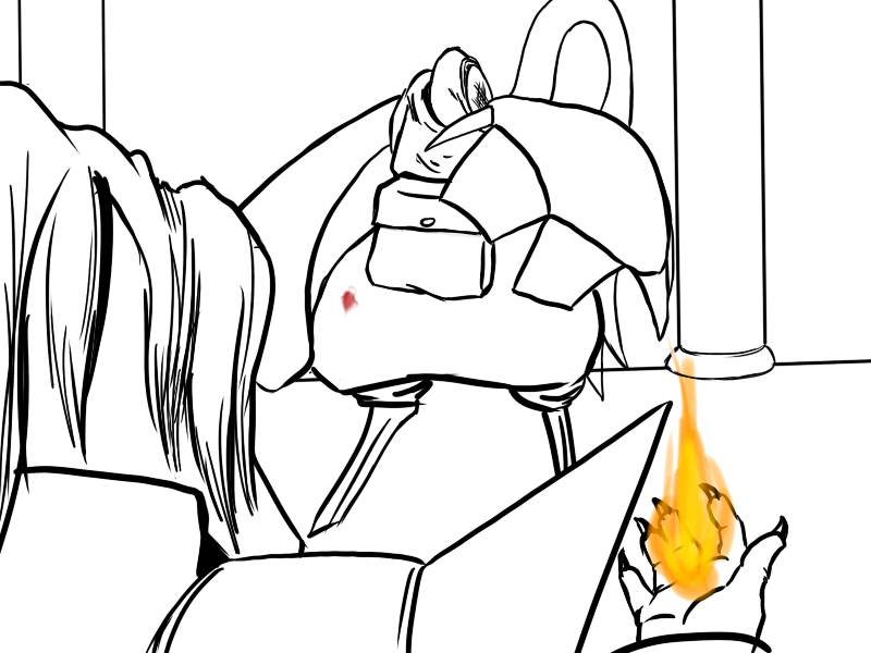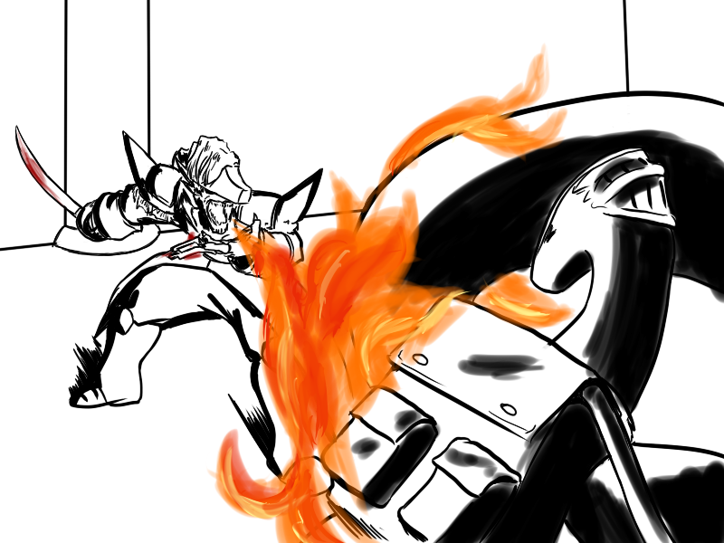 Now, Deme. This will hurt, but not as much as being killed. If you're only exposed to fire for a short moment, if you keep moving, it won't badly injure you. I suggest that you attack with the cudgel. He will use the fire, I think, and probably block it again, but that's ok; use the momentum to swing under as quick as possible and drive your leg up under his ribs.