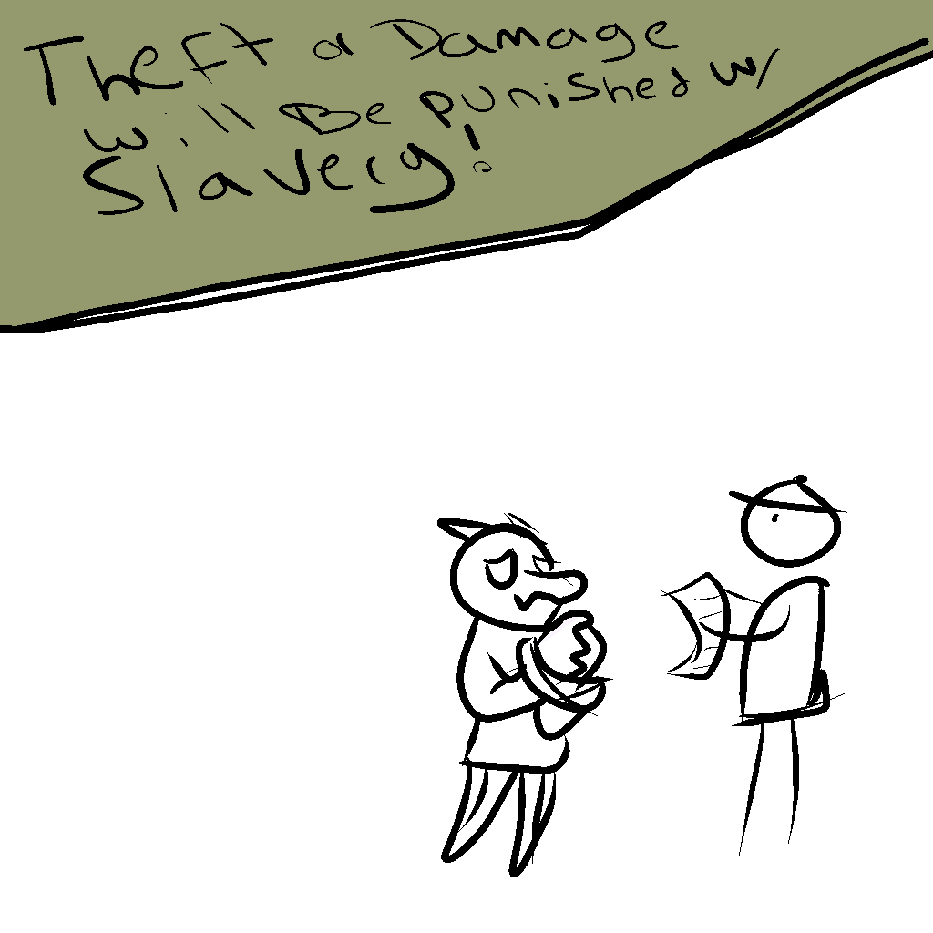 "Ah hem, all crimes will be punished with the Kobold in question being put up for auction to recoup the damages, Sorry man You seam nice"