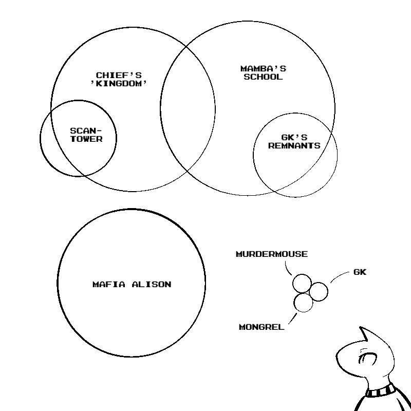 "The latter option, the throne, would allow me to treat the gang as its own entity that I just happen to be the ruler of. The throne itself must have absolute power over the entire gang either way, so that Mamba is forced to pursue the throne instead, rather than treating her school as its own faction to slowly overshadow the rest of the gang. Again, either option for this is subtle, as both involve forcibly glueing the gang together, declaring the ruler absolute, and saying that ruler is me. The challenge here is that if I just blindly and forcibly unify the gang under a single entity, such that any independent action or outright disobedience could rightfully be called treasonous, it would look like a petty display of dominance on my part, transparently looking like I fear that Mamba is eclipsing me. To veil my intentions, I would need a convenient excuse, some sort of external threat, that makes the gang seem threatened to the point that it must unite or be conquered in some manner. I apologize, I realize I'm rambling, and there may be plenty of other options entirely, but the point all returns to the fact that if I am removed from power, I must be removed absolutely."