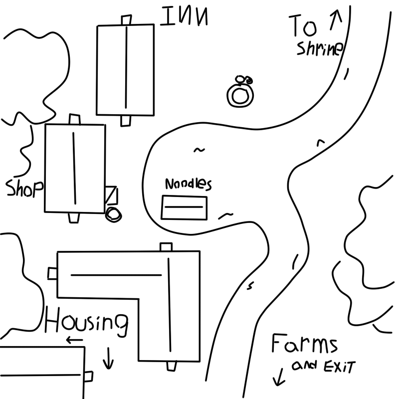 The wooden signboard placed in front of the shrine indicates the way you are heading leads to the next village. 'Tsut' What a drab name. It also reads that the path behind you with the fallen trees is towards the inn you can't show up at anymore.