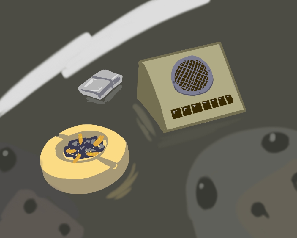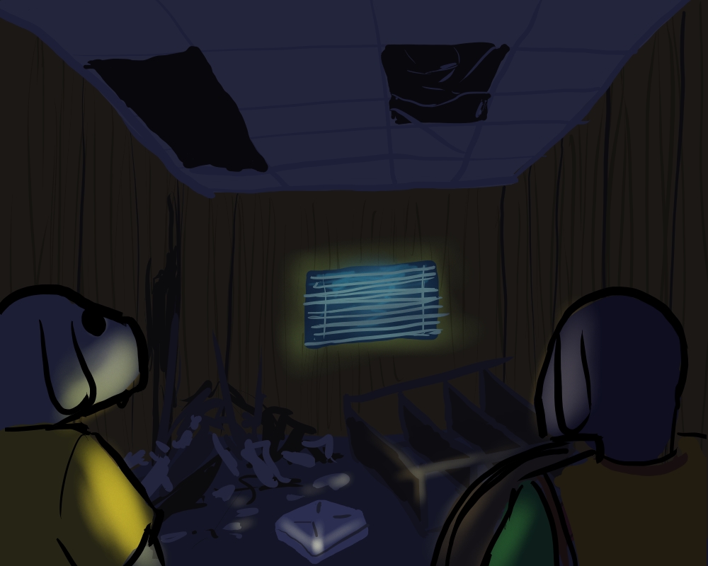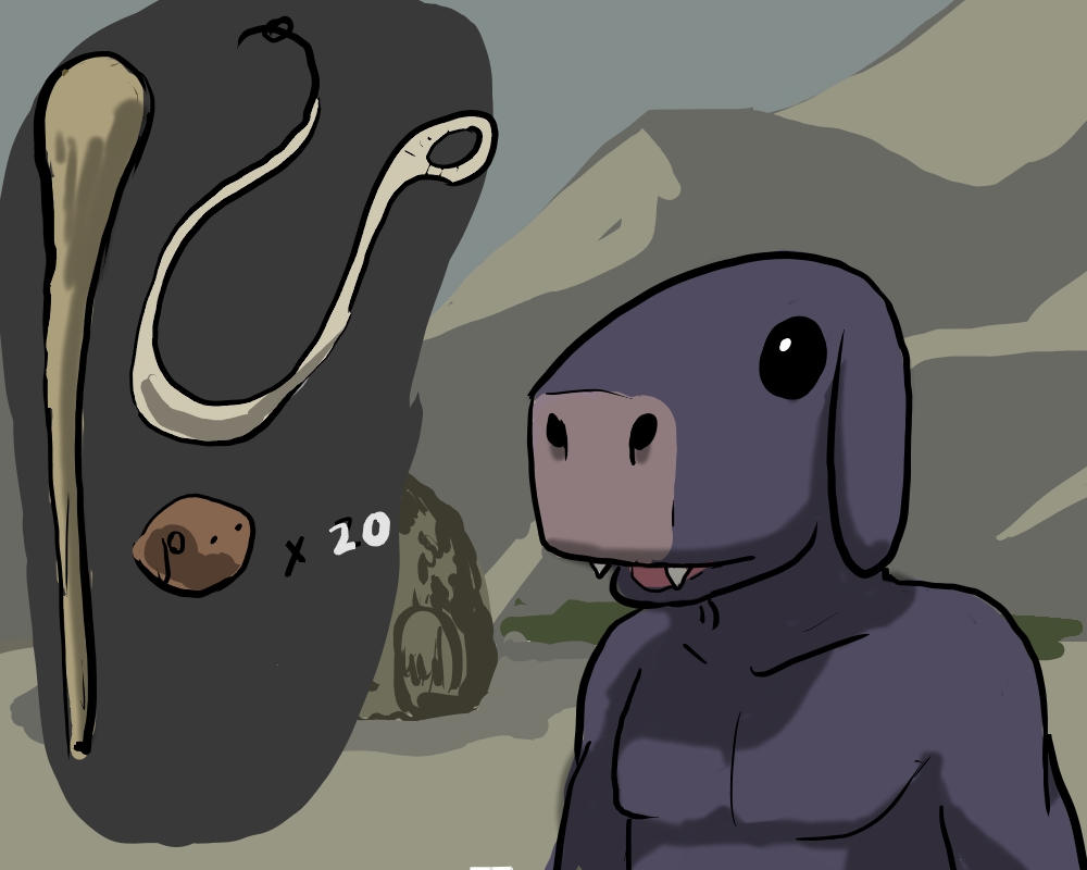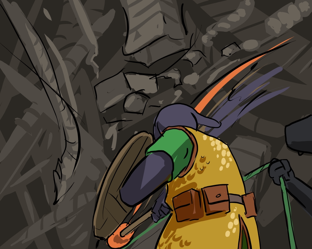 :slorsnis:"We probably shouldn't waste them now. The picture isn't a frying pan, it's a shield! It looks like it might stop things from harming your brains. If we had this earlier we could have poked YOU with it to stop that freak-out you had!"