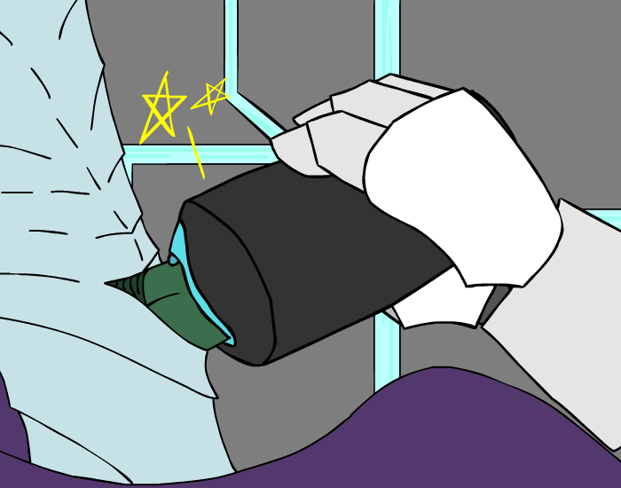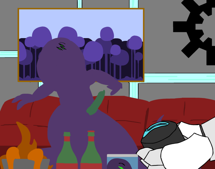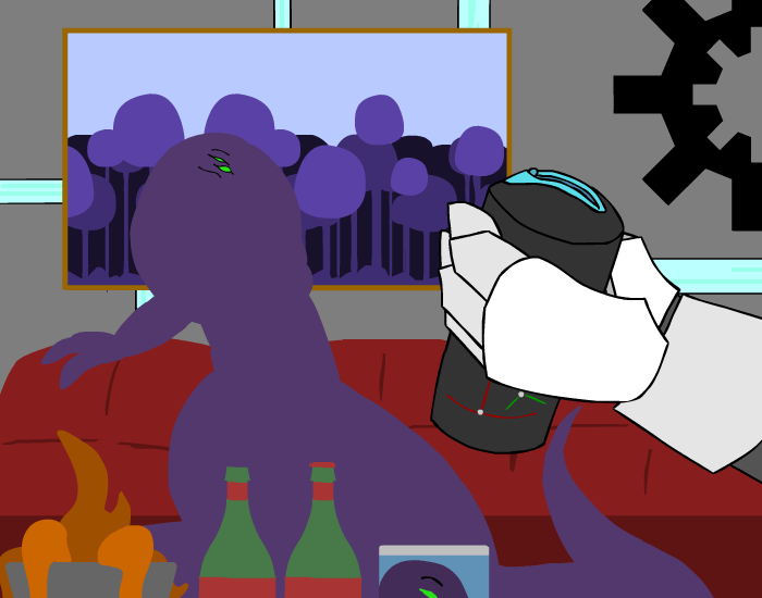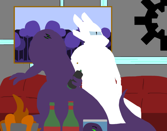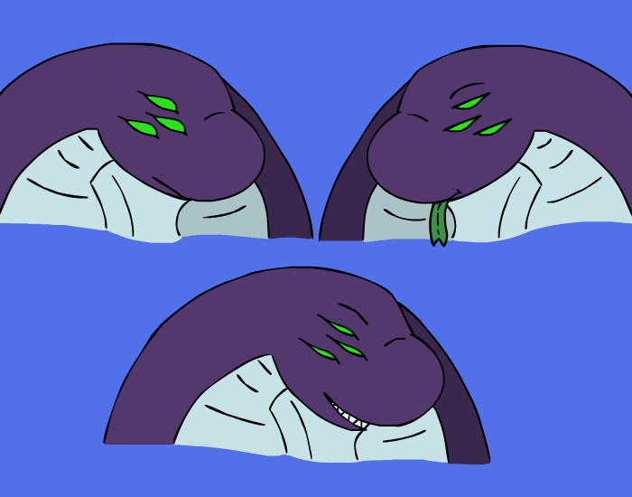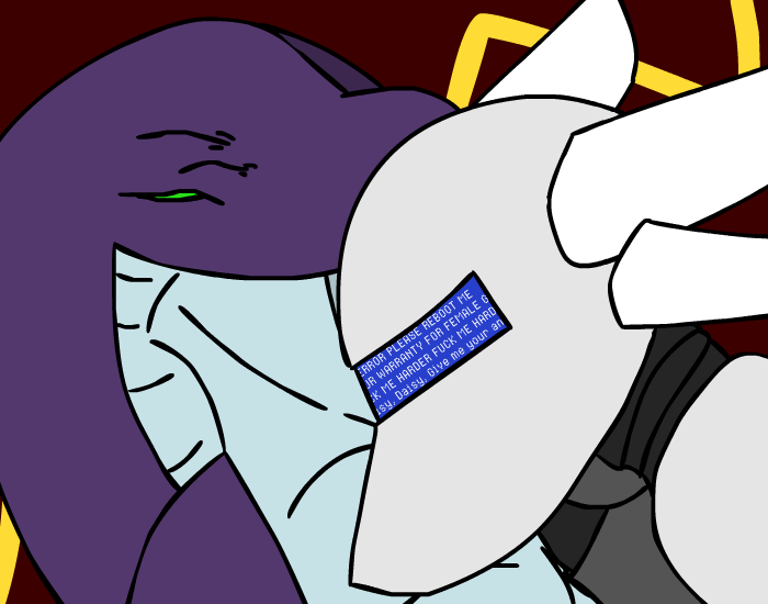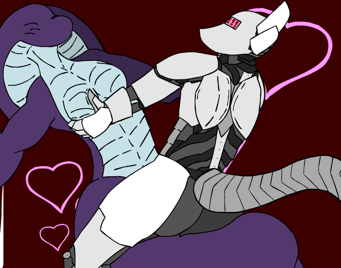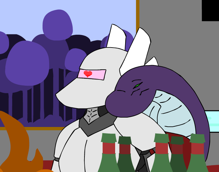 You let your tail slide over her metal shell, trying in vain to get an reaction from her without success as you massages her legs with your coils. Her cold metal plates scrapes against your scales as more and more of her body is consumed into your massive hug, but it isn’t until you’ve practically engulfed her whole lower body and put our head on her shoulder that you see a reaction from her. For just a moment, you watch as her head frills raises slightly, one quick motion that you nearly missed…