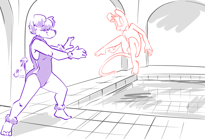 Casey pats the kobold on the shoulder, “We might want to find a seat. Wouldn’t want to miss this show.” They settle in together on a love seat, and curl up next to each other. “Are you guys going to need anything?” Casey asks, remembering the marathon session with the god a few weeks ago.