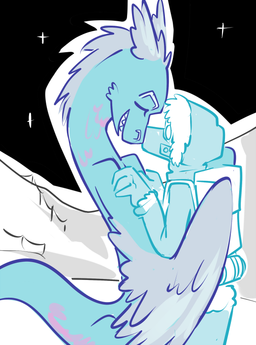 Cecil goes rigid, the feathers on his head floofing before settling again. The blushing bird glances sideways at the pair of voyeurs before staring straight ahead. He swallows and, in a shaking, breathless voice, tells his partner, “Y-yes.”