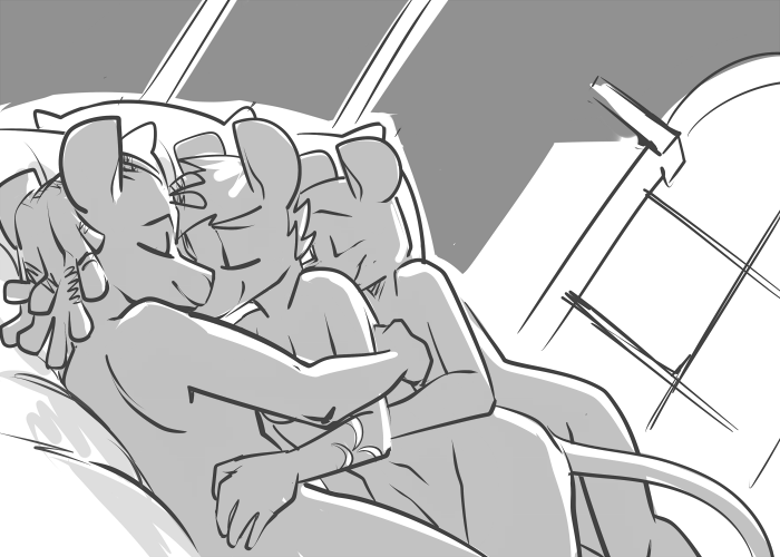 Casey lets her binding spells fade and together they catch her weight. The three of them sprawl in the sheets: sticky and satisfied. Sweet kisses are traded in the afterglow and soft I-love-you’s affirm each other in the dark.