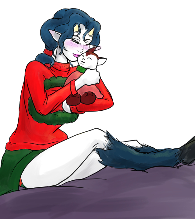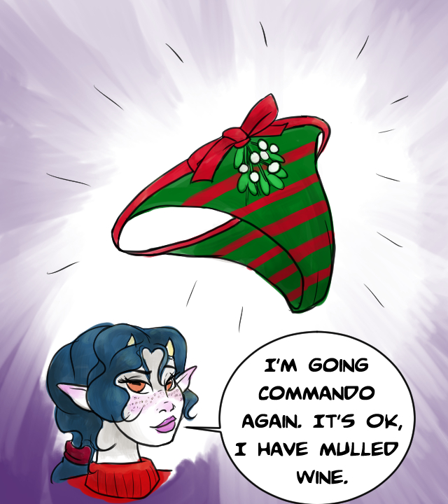 Nem: So ... this crossover multi-dimensional beard guy appears before me, and he says that he needs my panties... and I look at him and I want to say that I've heard that one before, but I didn't get to date much so actually it was the first time I've heard it. So I look at him like ... what the hell... and he looks at me and says he's dead serious, he needs them for a Secret Santa gift to balance things or something and then he waggles his cosmic beard and says like... he'll trade me for a Hin "body pillow" and some nice mulled wine.