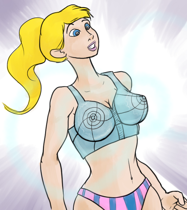 The OMNICLAUS has gifted Sarah with A POWER-BRA! Much more powerful than a wonder-bra, this armoured undergarment has advanced lighter-than-air technology to counter-act the forces of gravity and also capable of stretching in case her boobs grow like Power Girl's.
