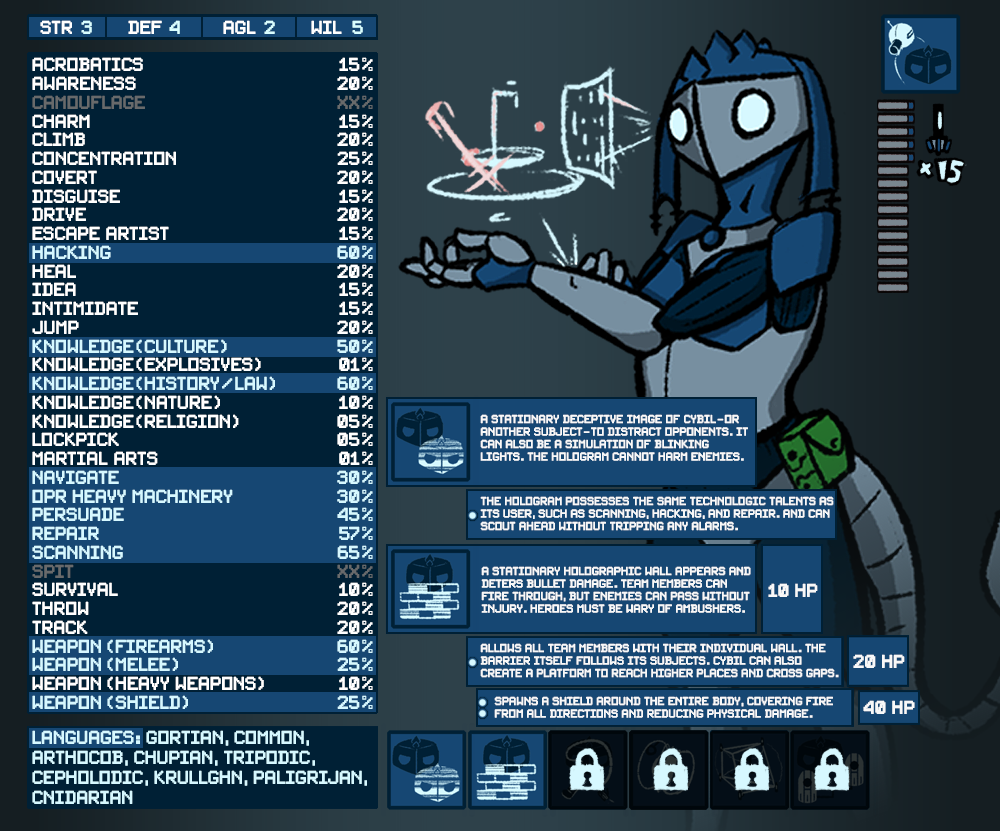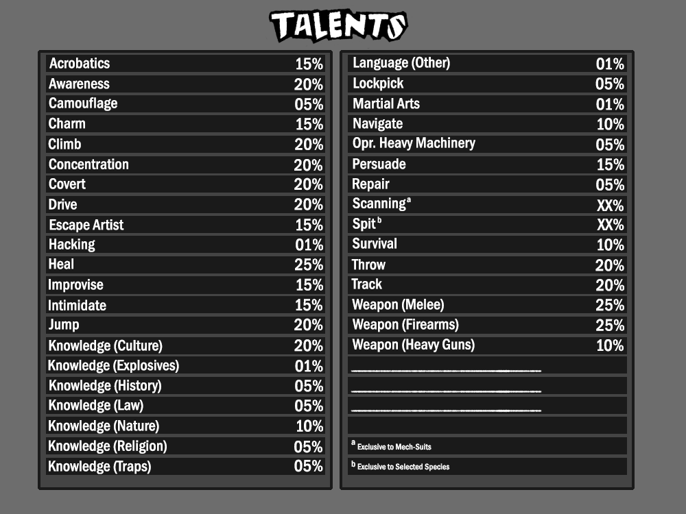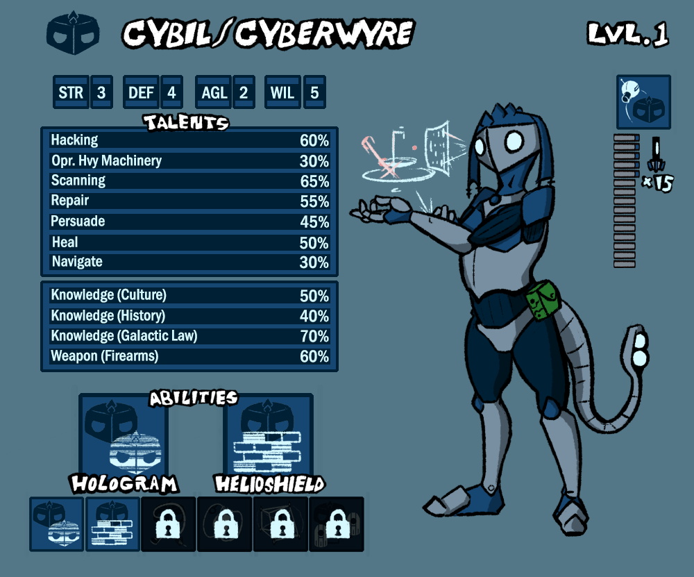 There will also be some edits in character sheets. Each character by default has seven talents (4 natural and studied, 3 hobbies), and I feel that being able to use a weapon and having high knowledge in something should be in their separate category. So while Cybil has Hack, Opr. Hvy. Machinery, Scan, Repair, and Persuade, I think Knowledge (History/Law) and Weapon (Firearms) can be replaced with something like Heal and Navigate. Meanwhile Language, Weapon Use, and Knowledge will be their own thing.